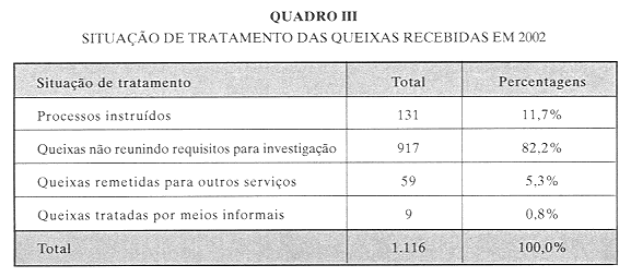- Quadro III Situação de Tratamento das Queixas Recebidas em 2002