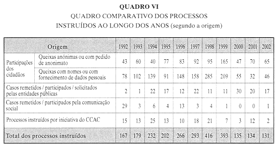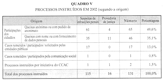- Quadro V Processos Instruídos em 2002 (segundo a origem)