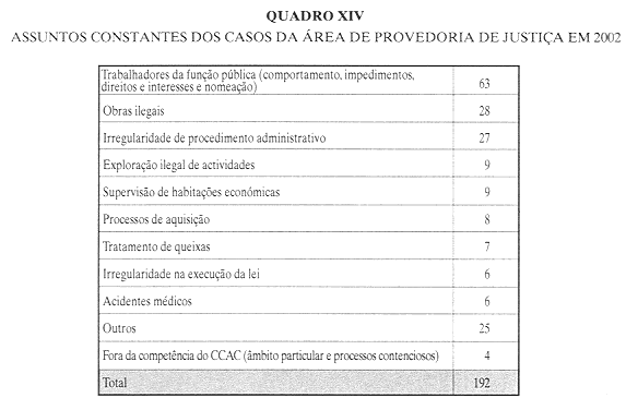 - Quadro XIV Assuntos Constantes dos Casos da Área de Provedoria de Justiça em 2002