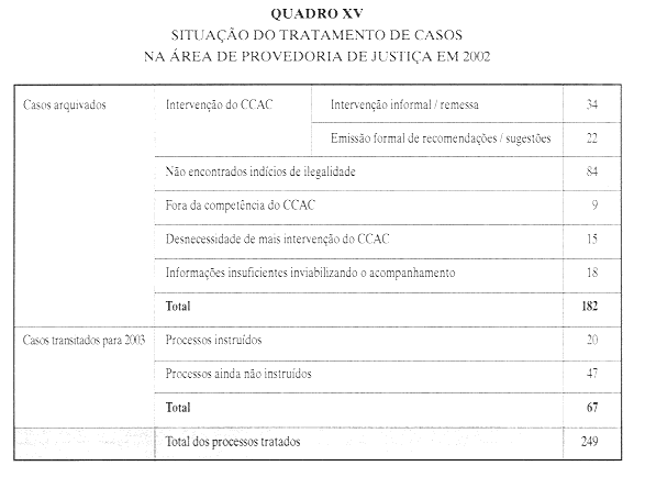 - Quadro XV Situação do Tratamento de Casos na Área de Provedoria de Justiça em 2002
