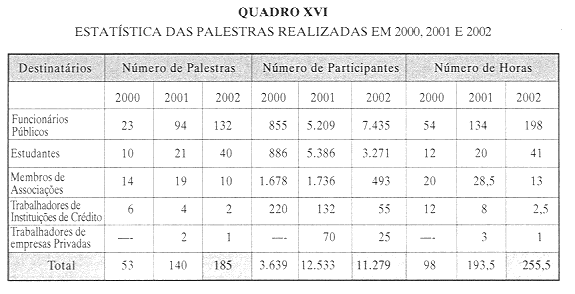 - Quadro XVI Estatística das Palestras realizadas em 2000, 2001 e 2002
