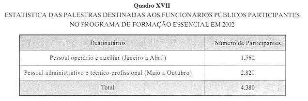 - Quadro XVII Estatística das Palestras destinadas aos Funcionários Públicos Participantes no Programa de Formação Essencial em 2002