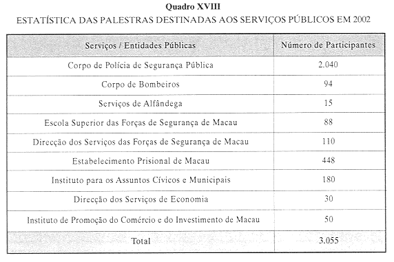 - Quadro XVIII Estatística das Palestras destinadas aos Serviços Públicos em 2002