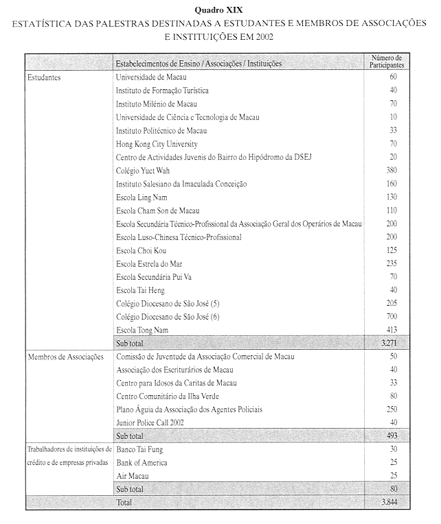Em 2002, a par da continuação das acções visando incutir nos alunos do ensino secundário a consciência de incorruptibilidade, o CCAC estendeu, pela primeira vez, as palestras aos 5 estabelecimentos de ensino superior, num esforço de sensibilização dos estudantes universitários. O Quadro XIX apresenta a estatística das palestras destinadas a estudantes, membros de associações cívicas e trabalhadores de instituições de crédito e de empresas privadas.