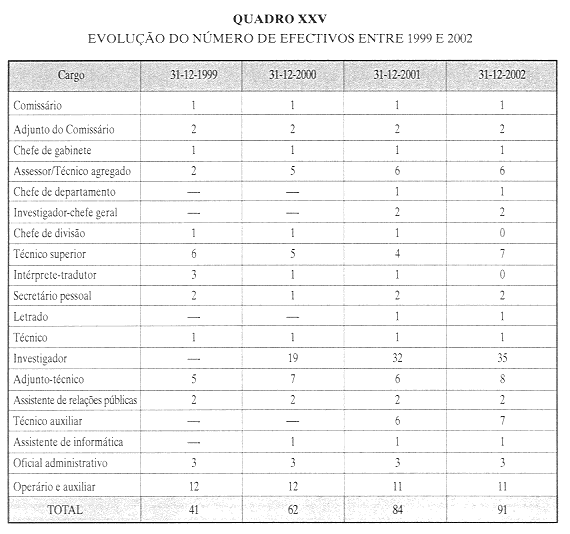 - Quadro XXV Evolução do Número de Efectivos entre 1999 e 2002