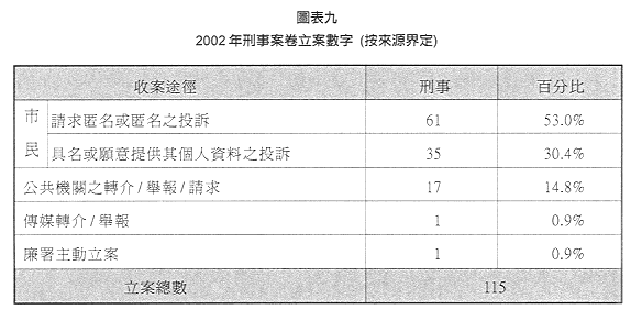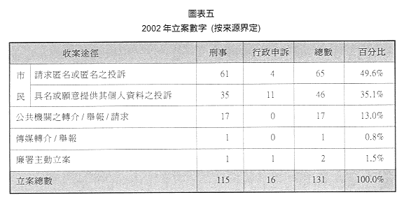 2002年立案的131宗案卷中,大部分來自市民的投訴和舉報,佔整體八成多,當中雖仍以匿名的居多,尤其集中在刑事性質的案卷,但不同者是匿名與具名兩者差距已明顯縮小,2001年相差約為28%,而2002年則大幅收窄至14.5%。反映市民的廉潔意識有所提高,勇於挺身舉報者有所增加,市民的監督力量正在提升,貪污活動已成高風險的犯罪行為。