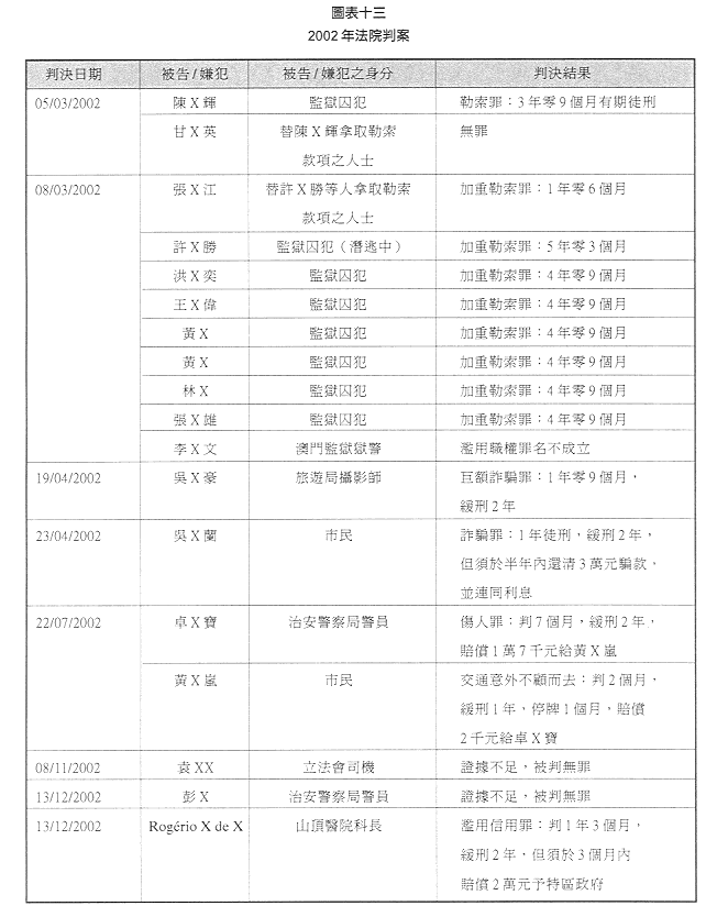 2002年移送檢察院的案卷共24宗,比上一年下降四成,惟仍略高於2000年水平,而2002年嫌犯人數則為歷年之冠。
