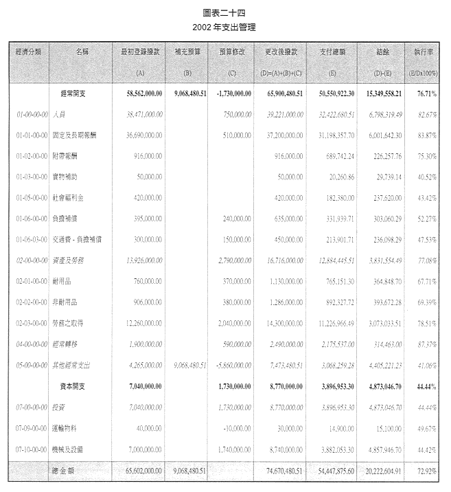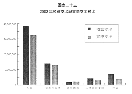 在預算總額MOP74,670,480.51(澳門幣七千四百六十七萬零四百八十元五角一分)中,實際支出 MOP54,447,875.6(澳門幣五千四百四十四萬七千八百七十五元六角),執行率為72.92%,這是由於部分預計於2002年內完成的計劃仍未全部落實,如無線電通訊系統工程須進行至2003年才全部完成,其次是廉署人員配備仍未被填滿,再者,擬於2002年內進行之購買及安裝文件數碼化及管理系統計劃(資料微縮系統)也因種種客觀原因而延期至2003年進行。