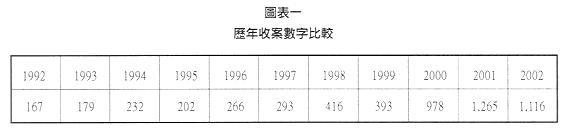 特區廉政公署成立後,經過2000及2001年連續兩年收案數字的大幅上升後,在2002年收案數字為1,116宗,比去年1,265宗下降約12%。是廉署成立三年來首次出現輕微下降,這與三年來貪污現象明顯收歛,政府部門的服務改善,社會廉潔意識普遍有了相當程度的提升有關。