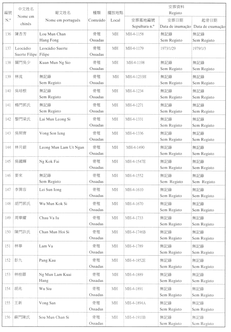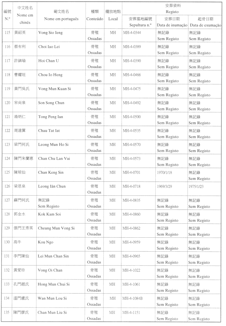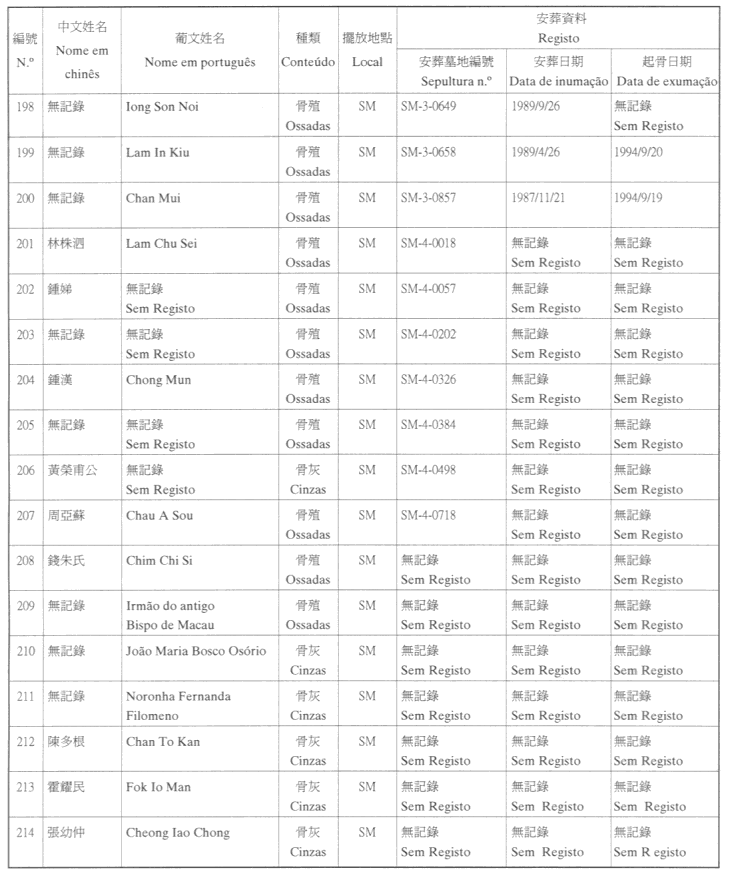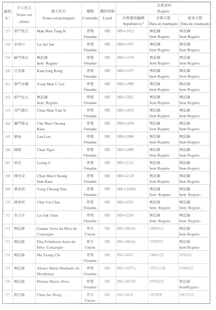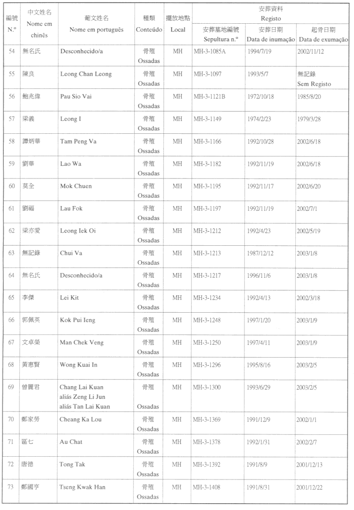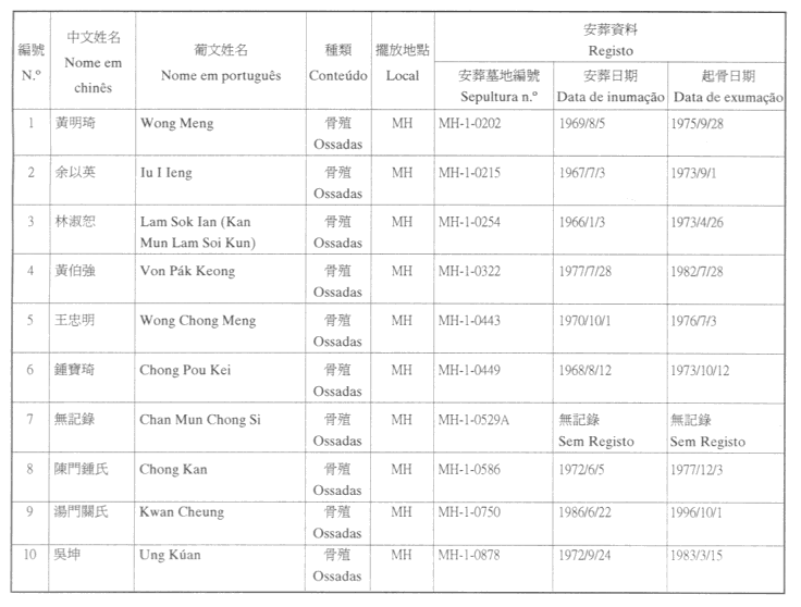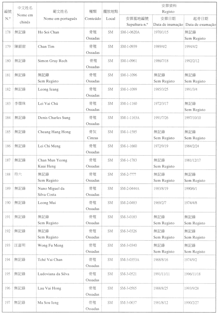 擺放在澳門市政墳場內之骨殖或骨灰名單