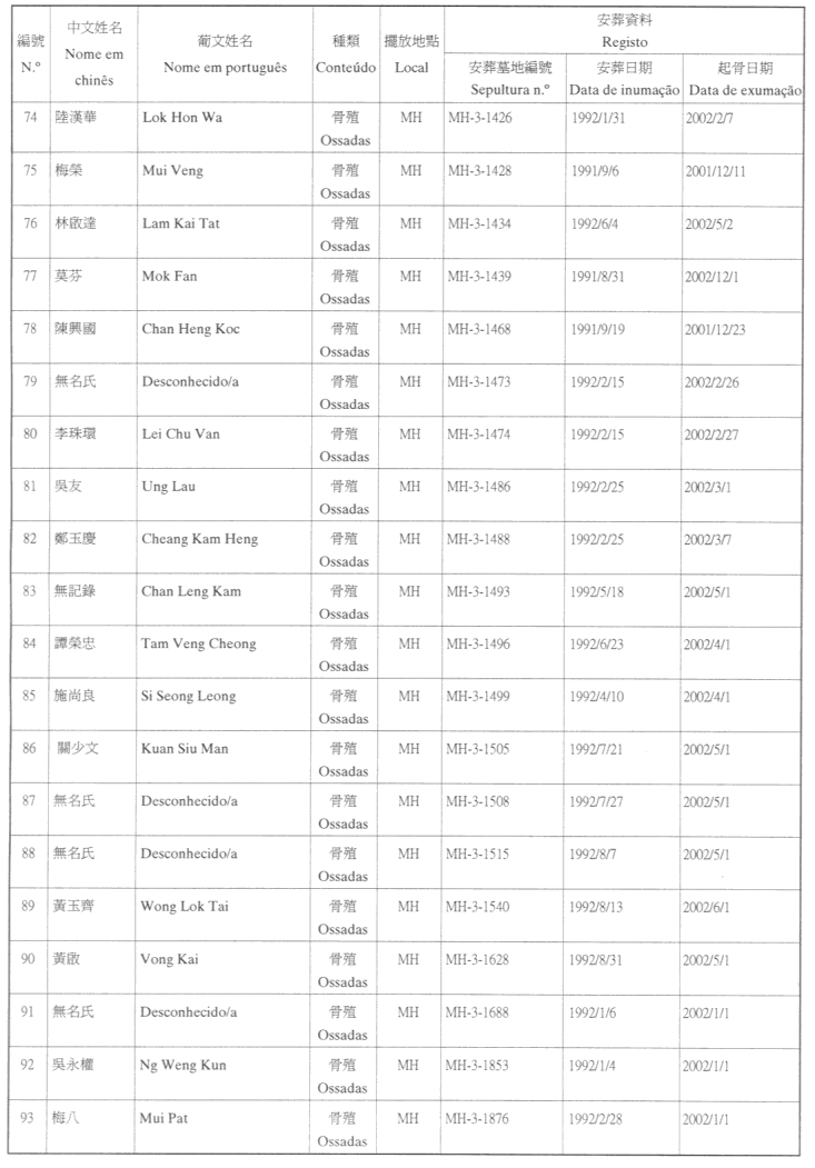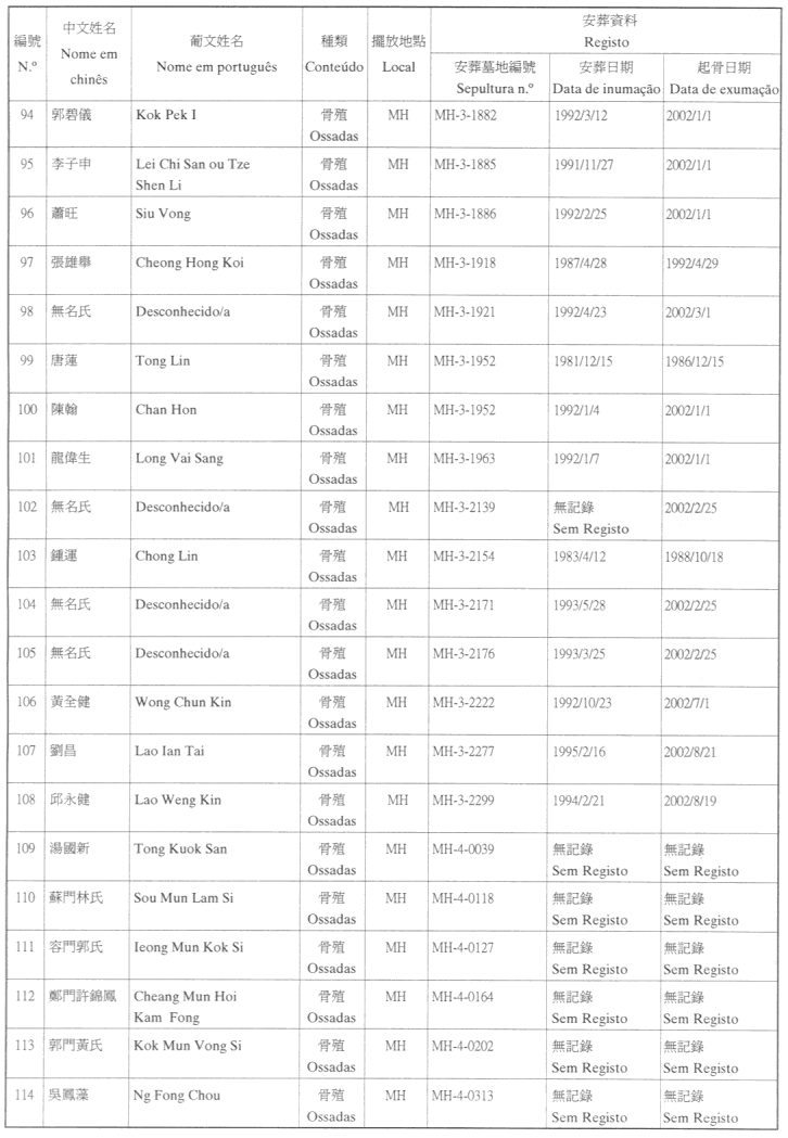 根據管理委員會主席於二零零三年四月十五日之批示,茲通知在澳門望廈聖母新西洋墳場或澳門聖味基舊西洋墳場擺放下列骨殖或骨灰的利害關係人,應在本通告刊登之日起計六十天內,前往上述墳場遷移有關骨殖或骨灰,逾期則由民政總署將之安放公共墓塚內。