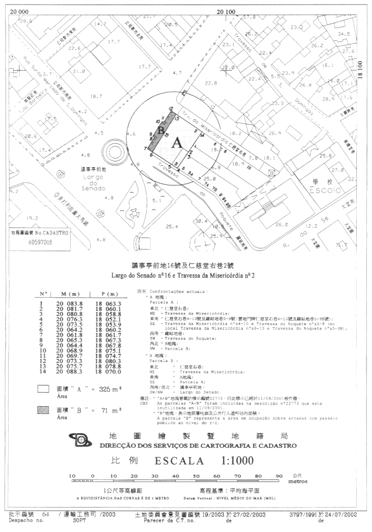 本合同標的為完善一幅以長期租借制度批出,面積396(叁佰玖拾陸)平方米,位於澳門半島,其上建有議事亭前地16號及仁慈堂右巷2號都市性房地產的土地的批給。該土地在地圖繪製暨地籍局於二零零二年七月二十四日發出的第3797/1991號地籍圖中以字母“A”及“B”標示,其利用權已由前澳門普通管轄法院第三分庭在第112/95號通常訴訟筆錄中作出,並於一九九六年三月十九日轉為確定的判決確認屬乙方所有。