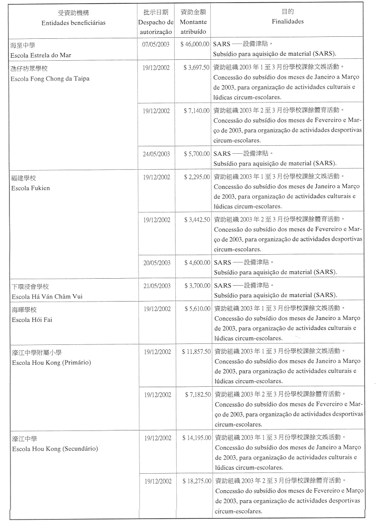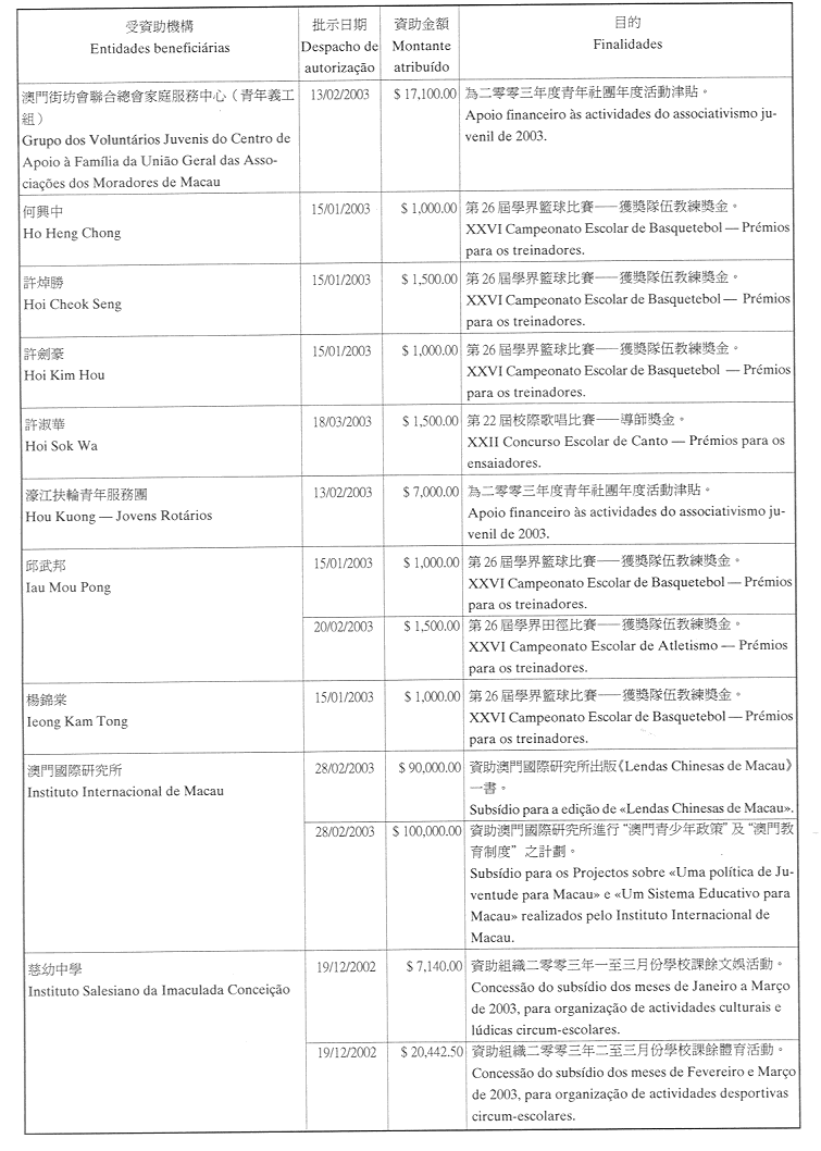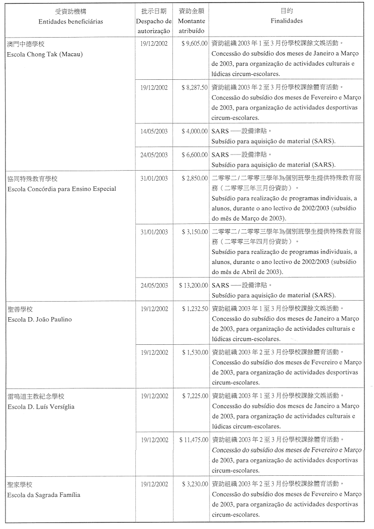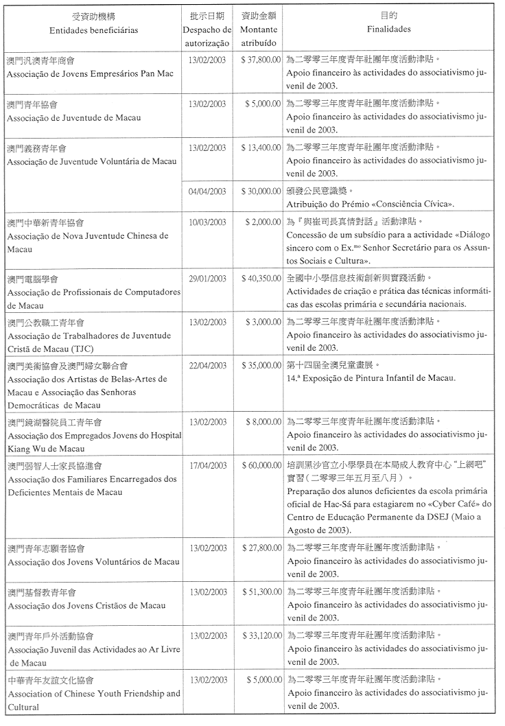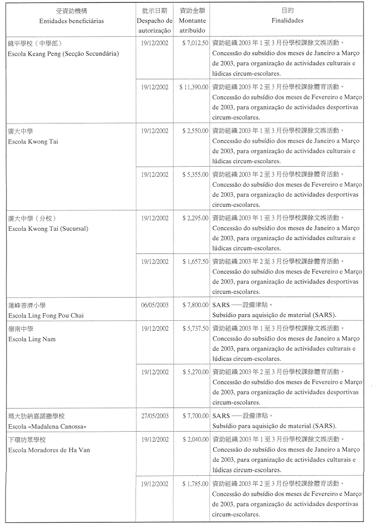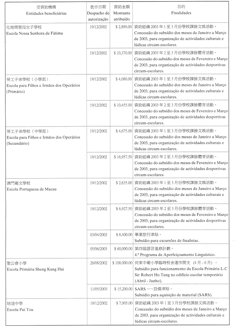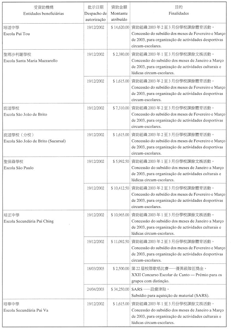 為履行關於給予私人及私人機構財政資助的八月二十六日第54/GM/97號批示,教育暨青年局現公佈二零零三年度第二季財政資助表: