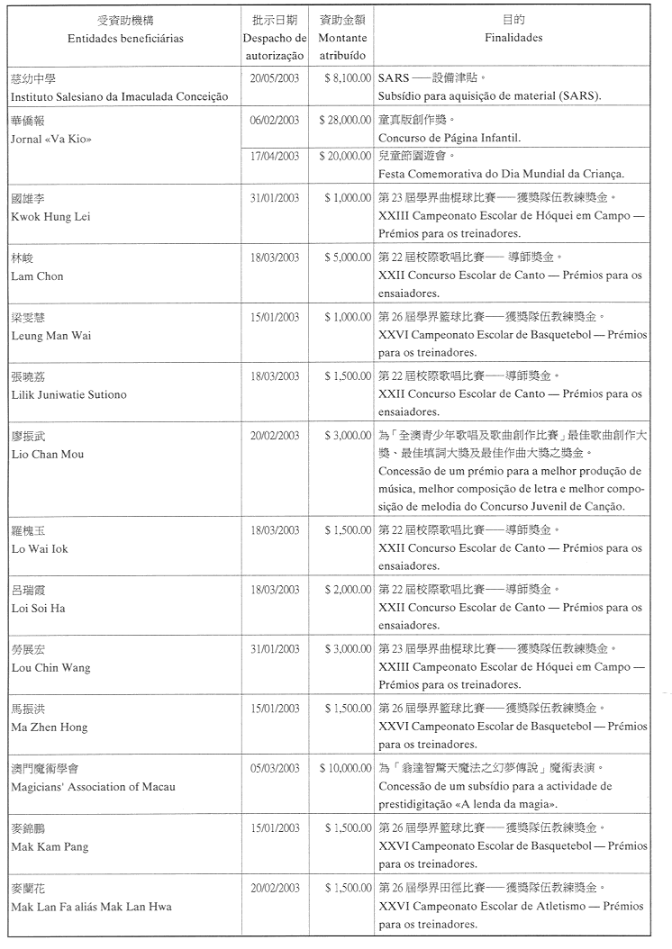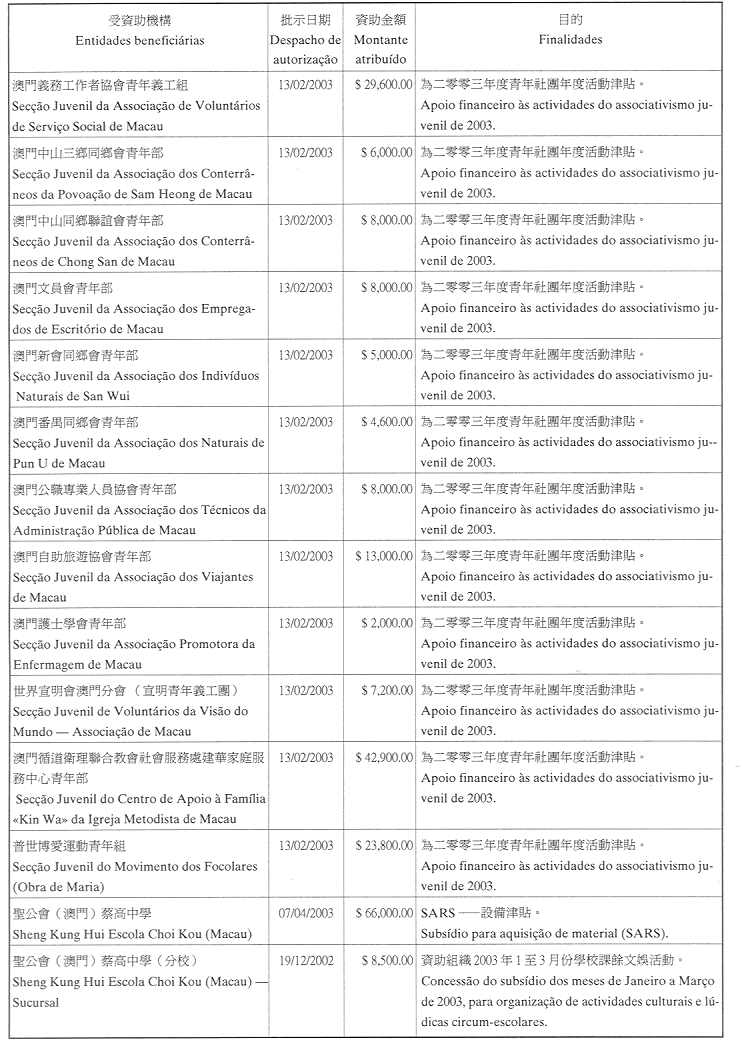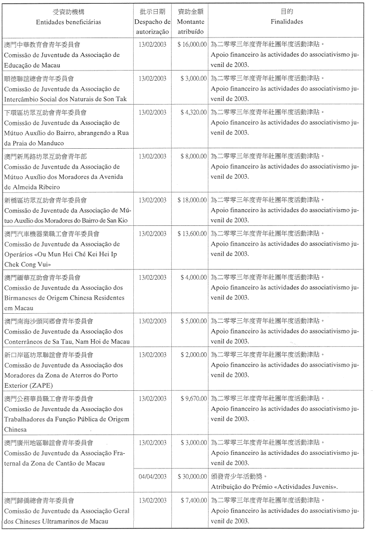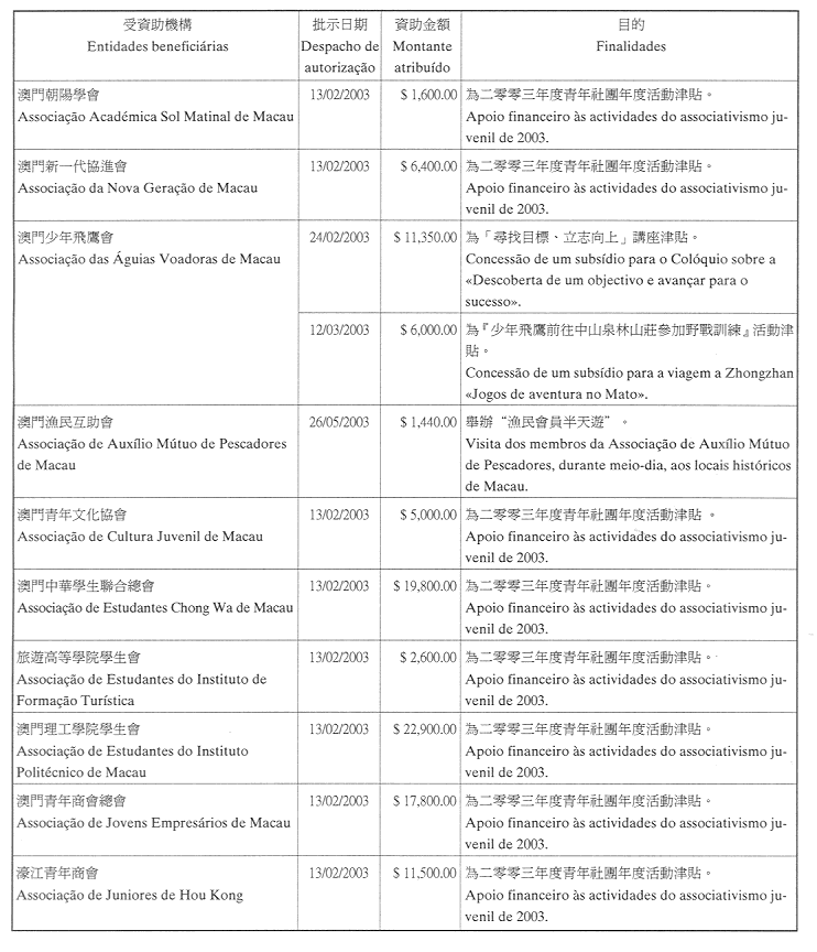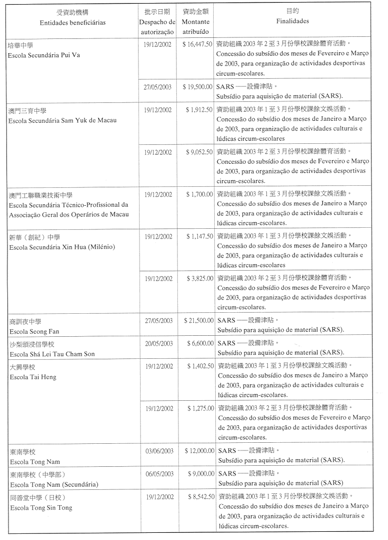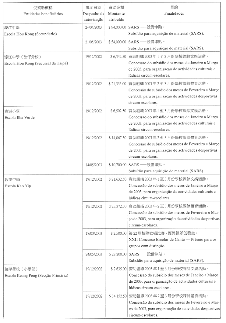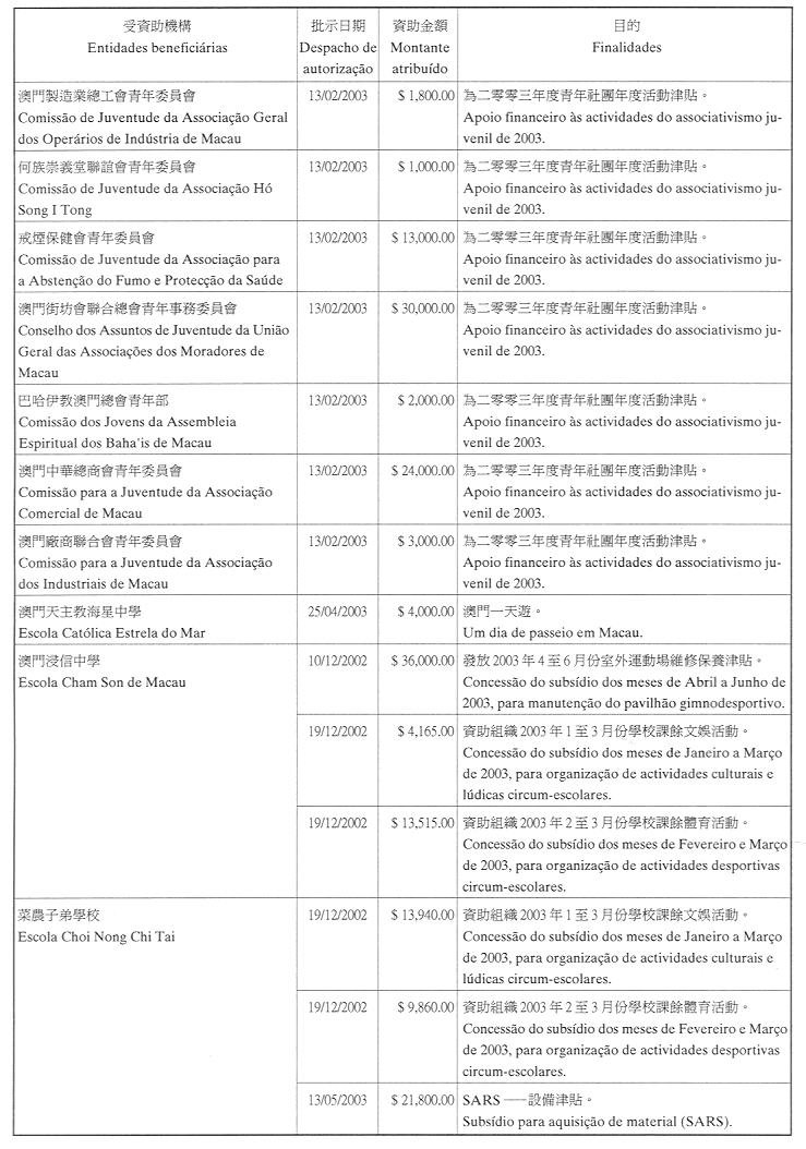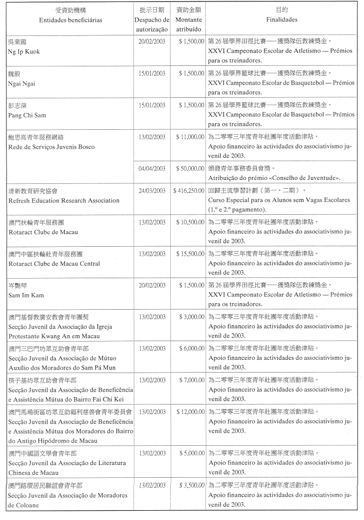 為履行關於給予私人及私人機構財政資助的八月二十六日第54/GM/97號批示,教育暨青年局現公佈二零零三年度第二季財政資助表: