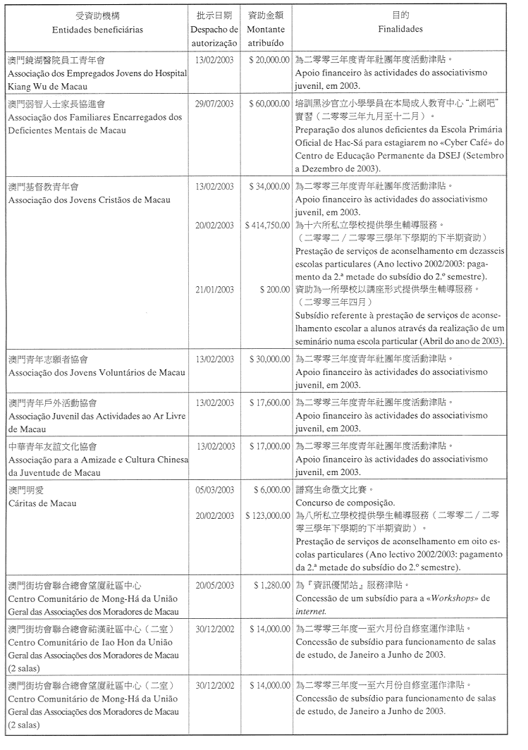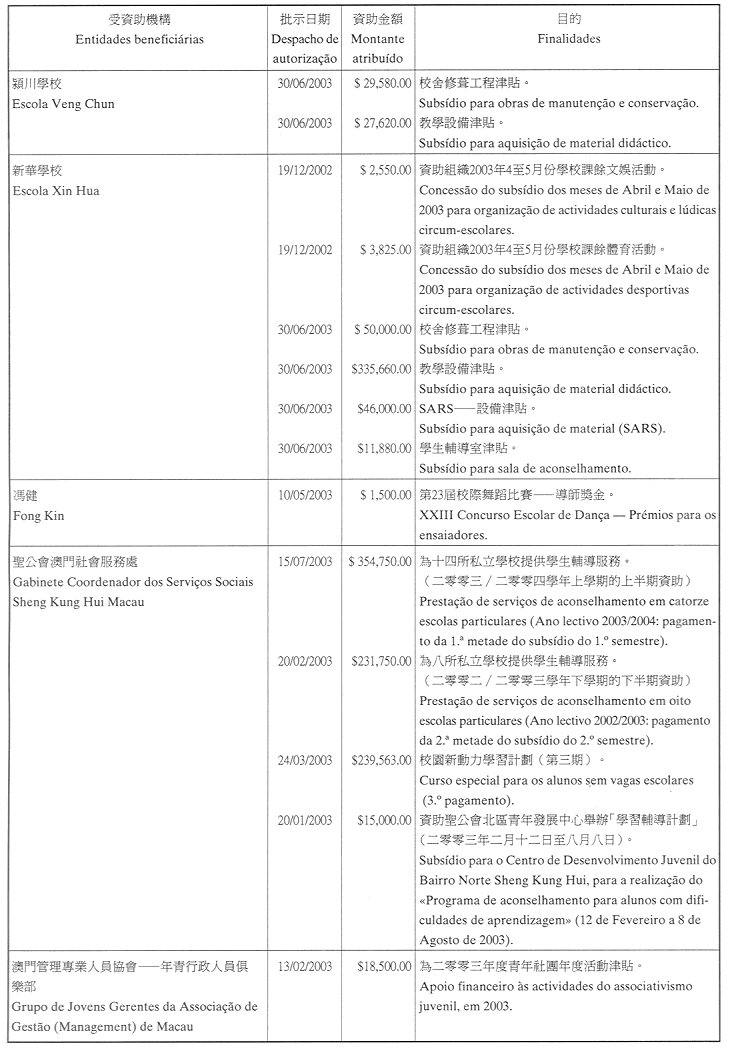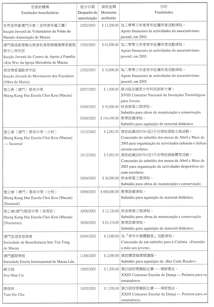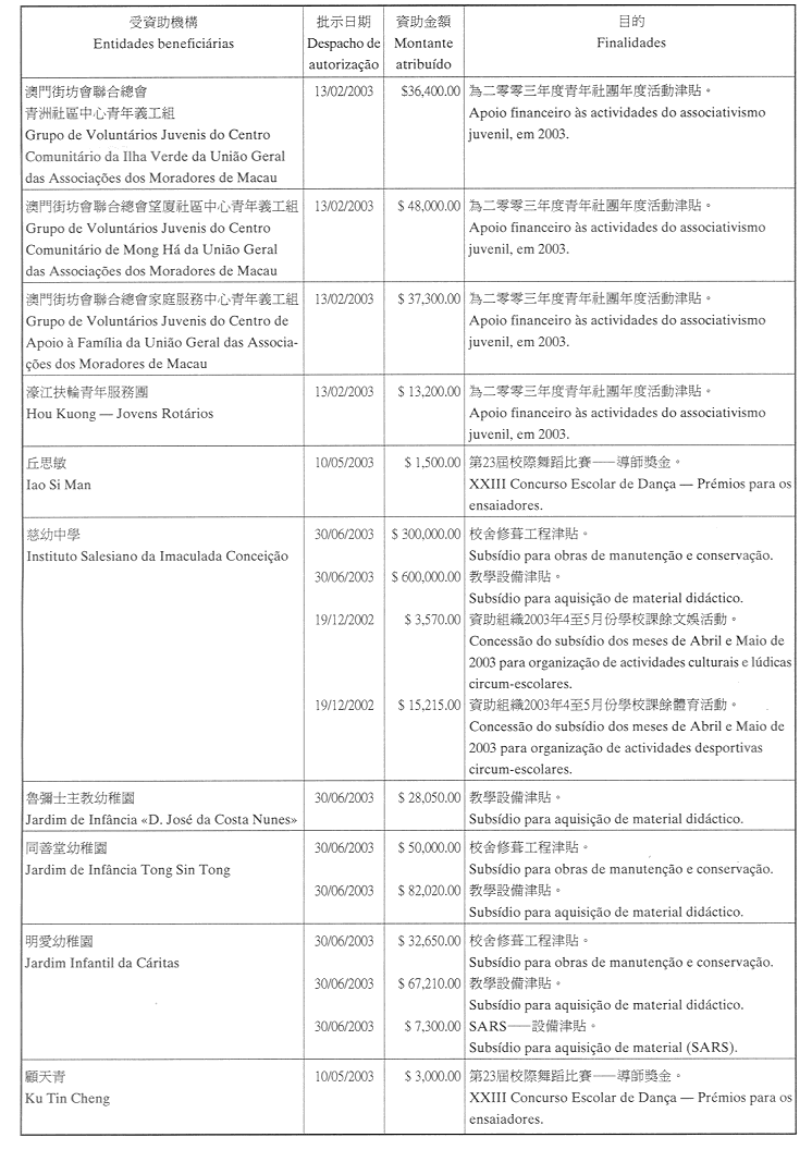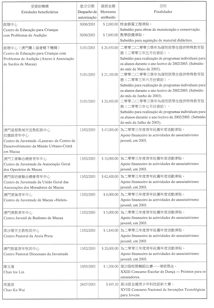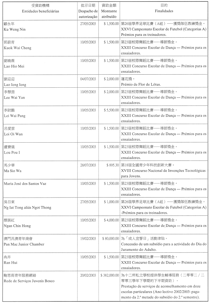 為履行關於給予私人及私人機構的財政資助的八月二十六日第54/GM/97號批示,教育暨青年局現公佈二零零三年度第三季財政資助表:
