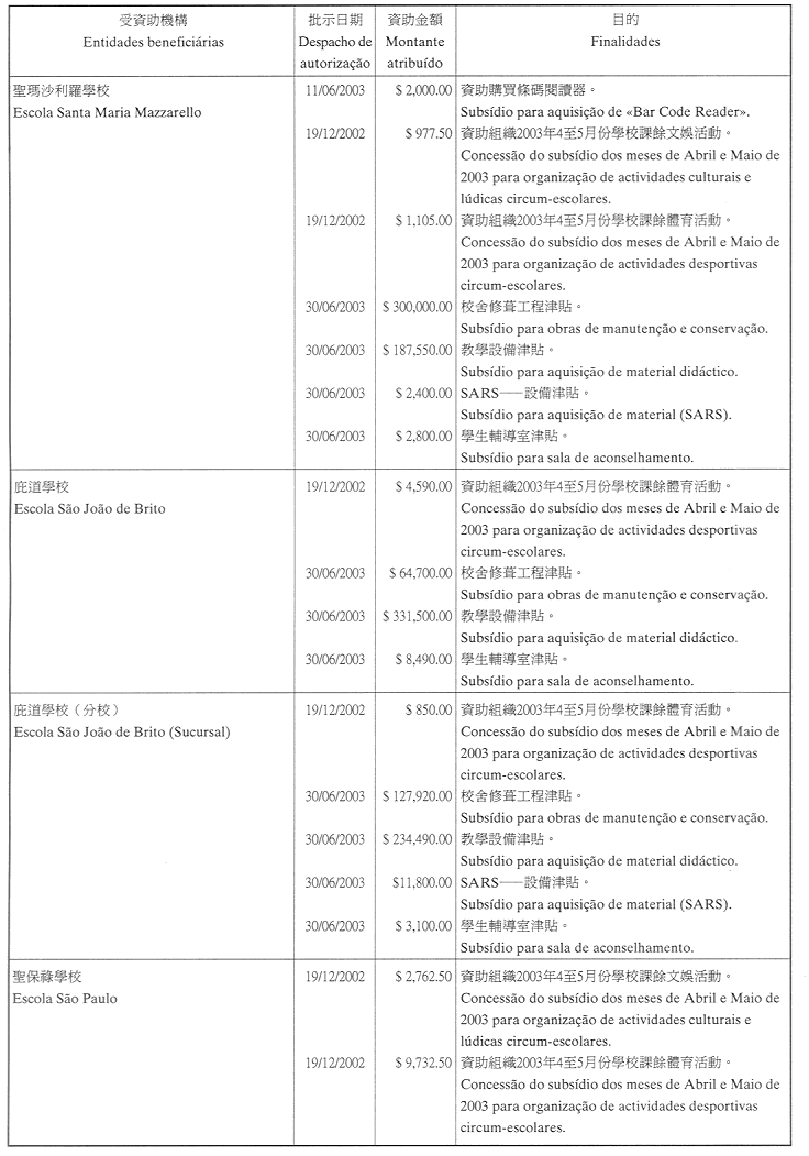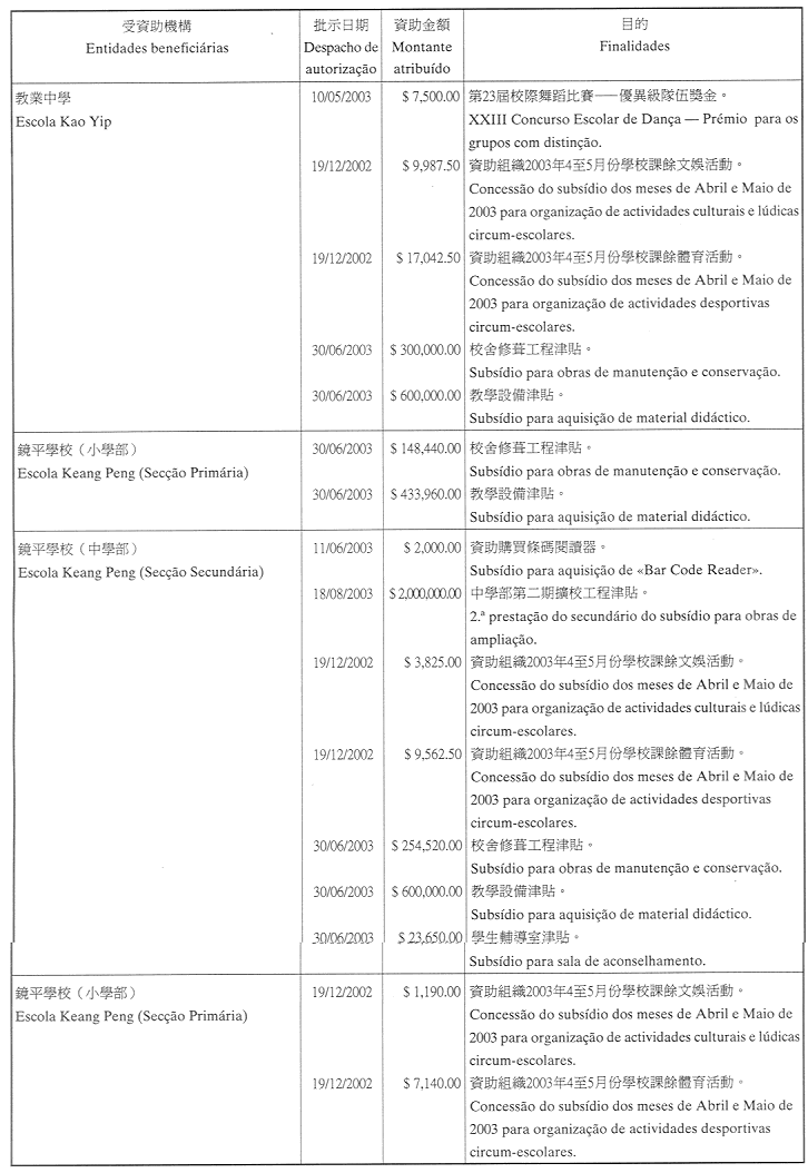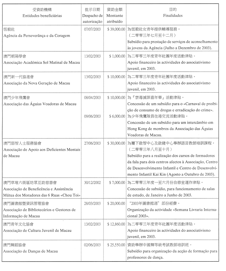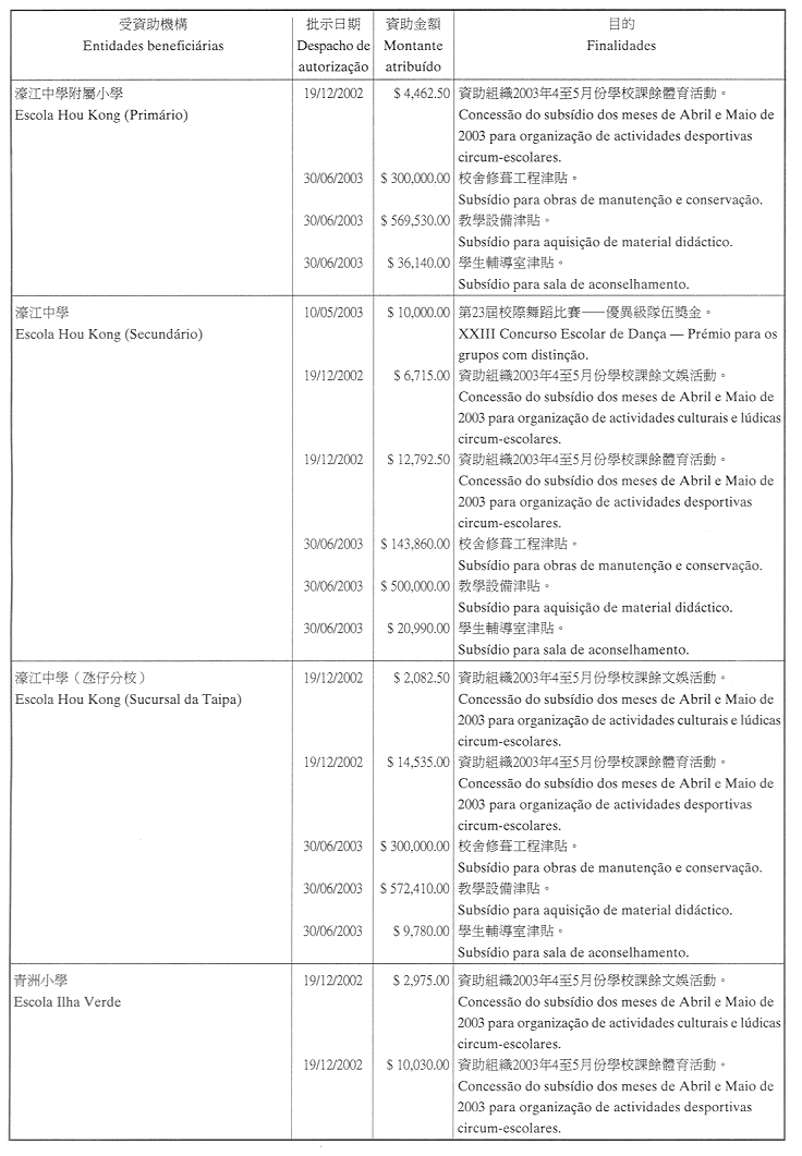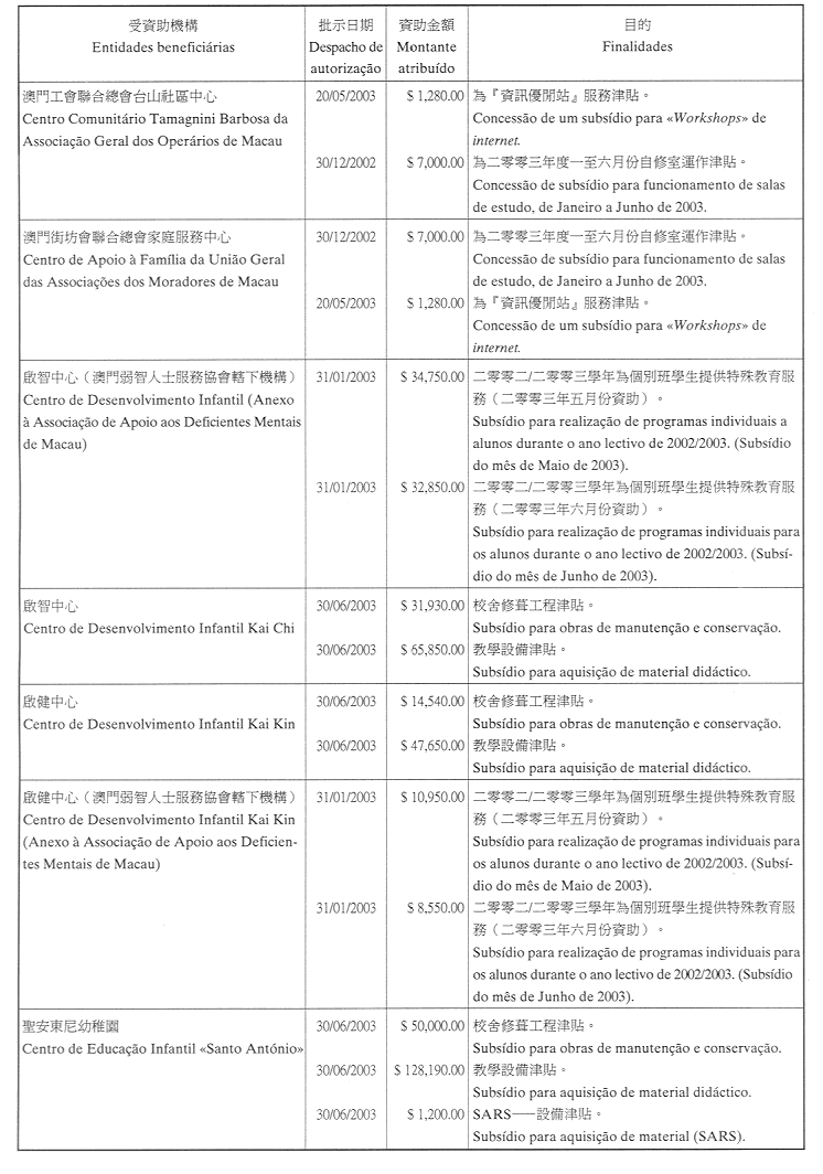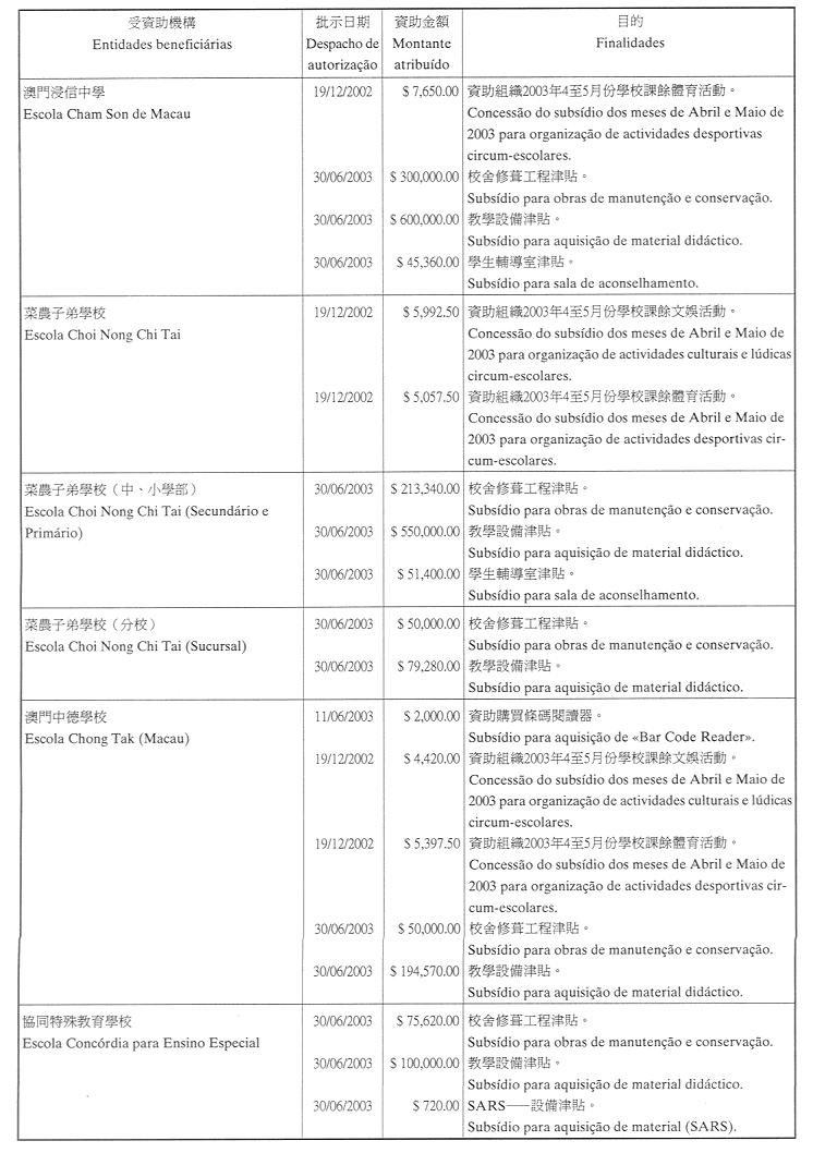 為履行關於給予私人及私人機構的財政資助的八月二十六日第54/GM/97號批示,教育暨青年局現公佈二零零三年度第三季財政資助表: