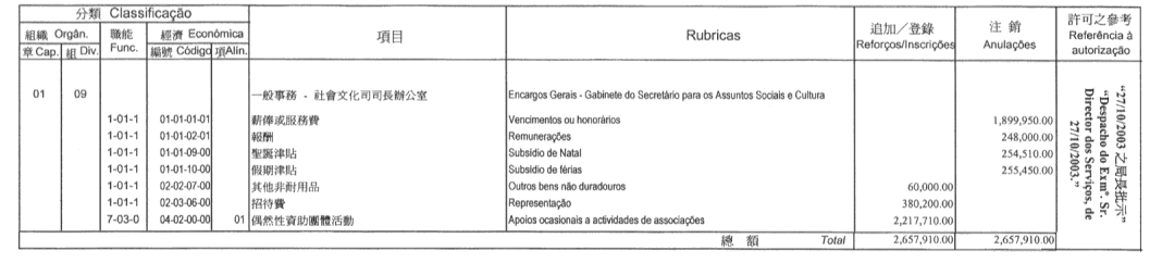 De acordo com o artigo 19.º do Decreto-Lei n.º 53/93/M, de 27 de Setembro, publica-se a alteração orçamental do orçamento privativo do Fundo de Desenvolvimento Desportivo de 2003, autorizada por despacho de 27 de Outubro do mesmo ano, do Ex.mo Senhor Secretário para os Assuntos Sociais e Cultura: