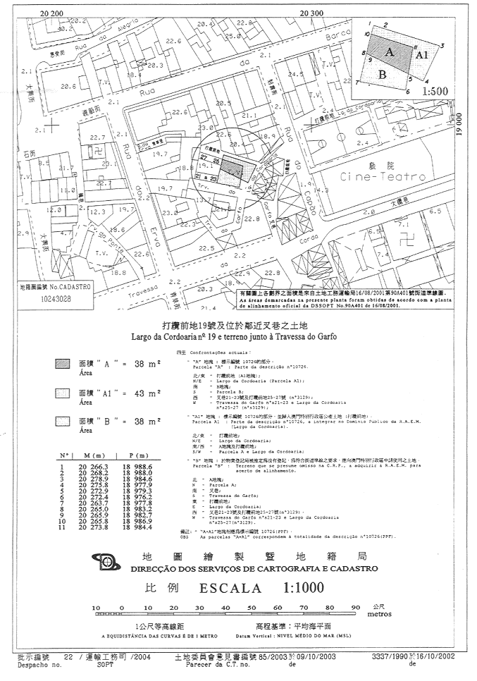 三、上述的準線規定須將上指土地的一幅面積為43平方米的地塊納入公產,用作擴闊鄰近的公共街道,另一方面,其餘的土地與另一幅屬澳門特別行政區所有,面積為38平方米,未有在物業登記局標示,以字母“B”標示在第3337/1990號地籍圖中的新地塊合併,形成一幅面積為76平方米的地段。