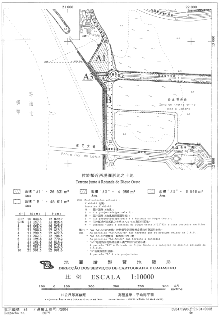 一、鑒於計劃在路氹城靠近氹仔島南部遊艇碼頭,鄰近西堤圓形地,一幅面積為38,363平方米的土地上興建一個娛樂及商業區,故必須對該區已確定的地段劃分和城市規劃標準作出修改,以及將面積6,846平方米的土地脫離澳門特別行政區公產,並作為無主土地納入澳門特別行政區私產,成為西堤馬路一部分。