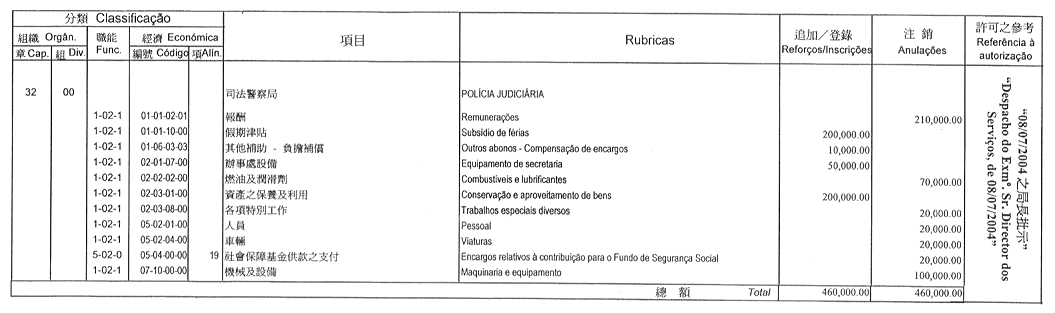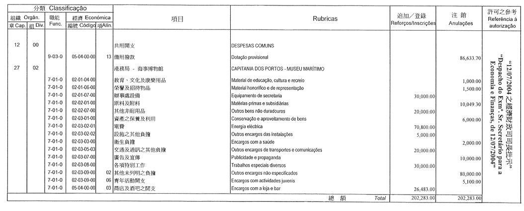 根據九月二十七日第53/93/M號法令第十九條的規定,茲公佈經由保安司司長於二零零四年七月五日批准之澳門監獄基金二零零四年度預算之修改: