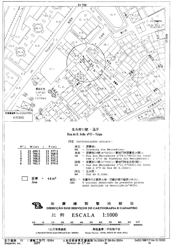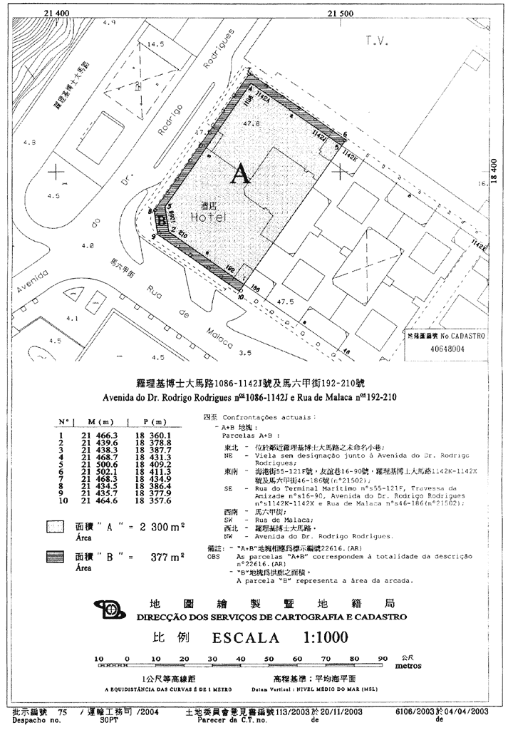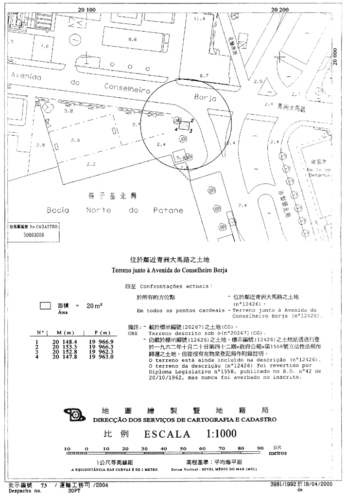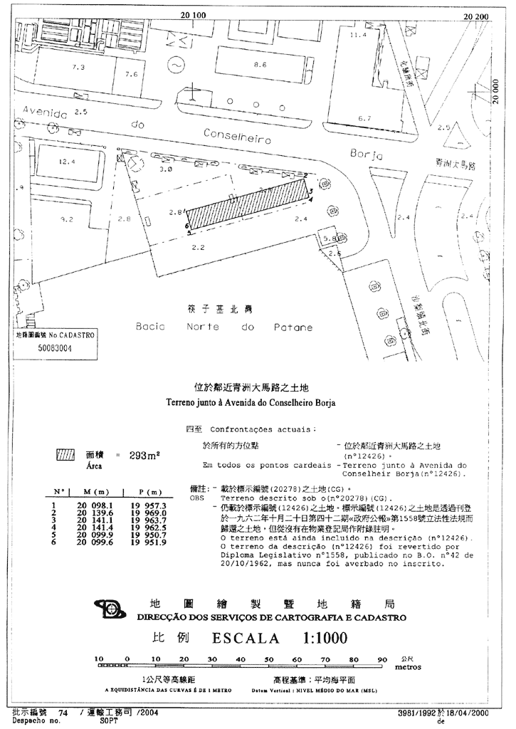 O terreno, descrito na Conservatória do Registo Predial (CRP) sob o n.º 20 267 e cujo domínio útil se encontra inscrito a favor do concessionário sob o n.º 6 982, acha-se assinalado na planta n.º 3 981/1992, emitida pela Direcção dos Serviços de Cartografia e Cadastro (DSCC) em 18 de Abril de 2000.