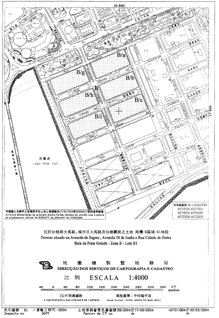 10. O terreno objecto de concessão, com a área total de 64 518 m2, designado por lote «B1», resulta da anexação dos lotes «B/a», «B/b», «B/c», «B/g», «B/h» e «B/i» da zona B do empreendimento designado por «Fecho da Baía da Praia Grande», nos NAPE, assinalados na planta n.º 4 672/1994, emitida pela Direcção dos Serviços de Cartografia e Cadastro (DSCC), em 2 de Março de 2004, e da faixa de arruamentos assinalada com a letra «B», desafectada do domínio público e integrada no domínio privado da Região Administrativa Especial de Macau, como terreno vago, através do Despacho do Secretário para os Transportes e Obras Públicas n.º 54/2004, publicado no Boletim Oficial n.º 22/2004, II Série, de 2 de Junho, descrita na Conservatória do Registo Predial (CRP) sob o n.º 23 131.