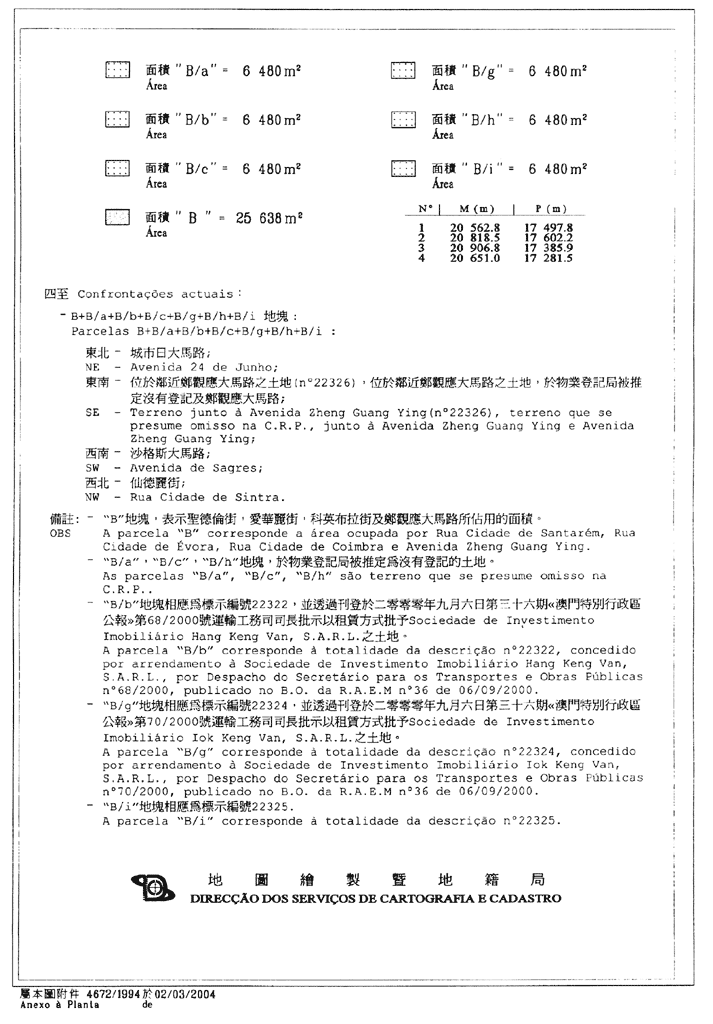 2. A situação registral das várias parcelas que constituem o terreno é a seguinte: a parcela de terreno assinalada com a letra «B» encontra-se descrita na CRP sob o n.º 23 131 e inscrita a favor da Região Administrativa Especial de Macau sob o n.º 88 241G; as parcelas de terreno assinaladas com as letras «B/a», «B/c» e «B/h», não se encontram descritas na CRP; as parcelas de terreno assinaladas com as letras «B/b», «B/g» e «B/i» encontram-se descritas na CRP sob os n.os 22 322, 22 324 e 22 325, respectivamente, e inscritas a favor da Região sob os n.os 83 630G, 83 629G e 15 744G.