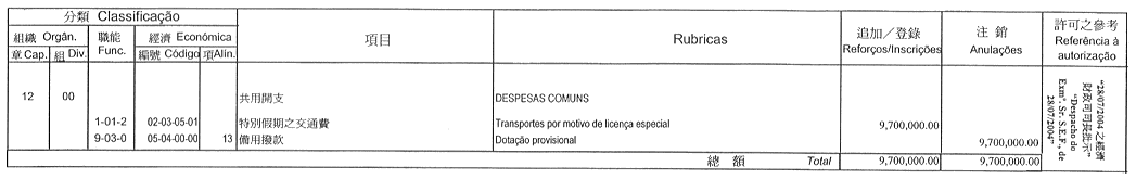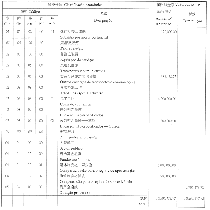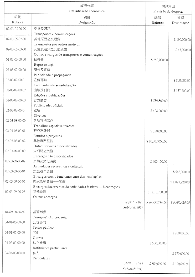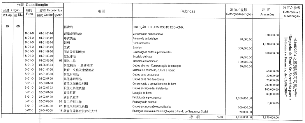 根據九月二十七日第53/93/M號法令第十九條規定,茲公佈經由終審法院院長辦公室管理委員會於二零零四年七月二十三日批准及行政長官於二零零四年七月二十七日核准之終審法院院長辦公室二零零四年財政年度本身預算之第一次修改: