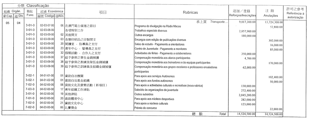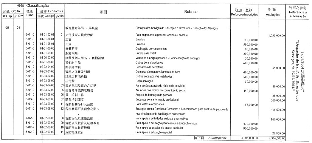 根據九月二十七日第53/93/M號法令第十九條的規定,現公佈由社會文化司司長於二零零四年七月二十九日批示所核准的澳門大學二零零四年財政年度本身預算之第二次修改: