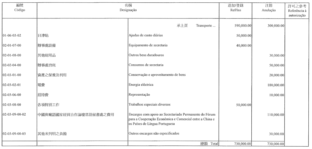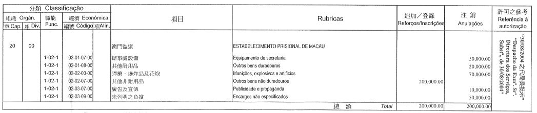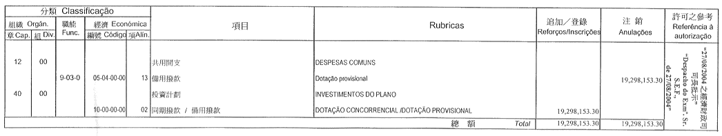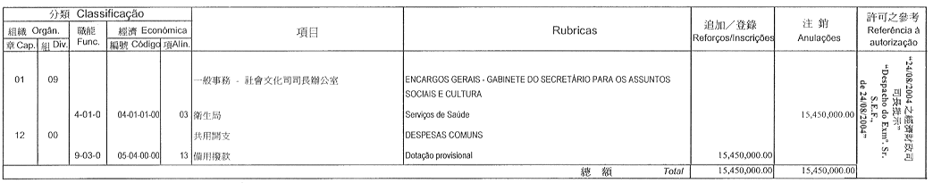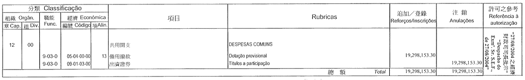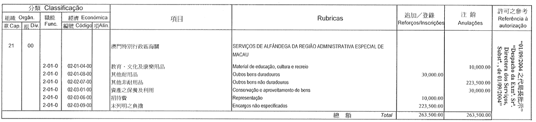 De acordo com o disposto no n.º 2 do artigo 11.º da Lei n.º 13/2003, de 29 de Dezembro, publicado no Boletim Oficial da Região Administrativa Especial de Macau n.º 52 (2.º suplemento), se publicam as seguintes alterações na distribuição da verba global do Cap.º 01-07 com as classificações funcional 8-01-0 e económica 04-01-05-00-05 da tabela de despesa corrente do orçamento da Região Administrativa Especial de Macau para o corrente ano económico, sob a designação: Transferências correntes — Sector Público — Outras — Gabinete de Apoio ao Secretariado Permanente do Fórum para a Cooperação Económica e Comercial entre a China e os Países de Língua Portuguesa, autorizadas nos termos do n.º 3 do artigo 21.º do Decreto-Lei n.º 41/83/M, de 21 de Novembro, na redacção dada pelo Decreto-Lei n.º 22/87/M, de 27 de Abril: