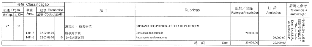 — De acordo com o Despacho n.º 17/GM/87, de 30 de Abril, se publicam as seguintes transferências de verbas (OR/2004), autorizadas nos termos do n.º 3 do artigo 21.º do Decreto-Lei n.º 41/83/M, de 21 de Novembro, na redacção dada pelo artigo 1.º do Decreto-Lei n.º 22/87/M, de 27 de Abril: