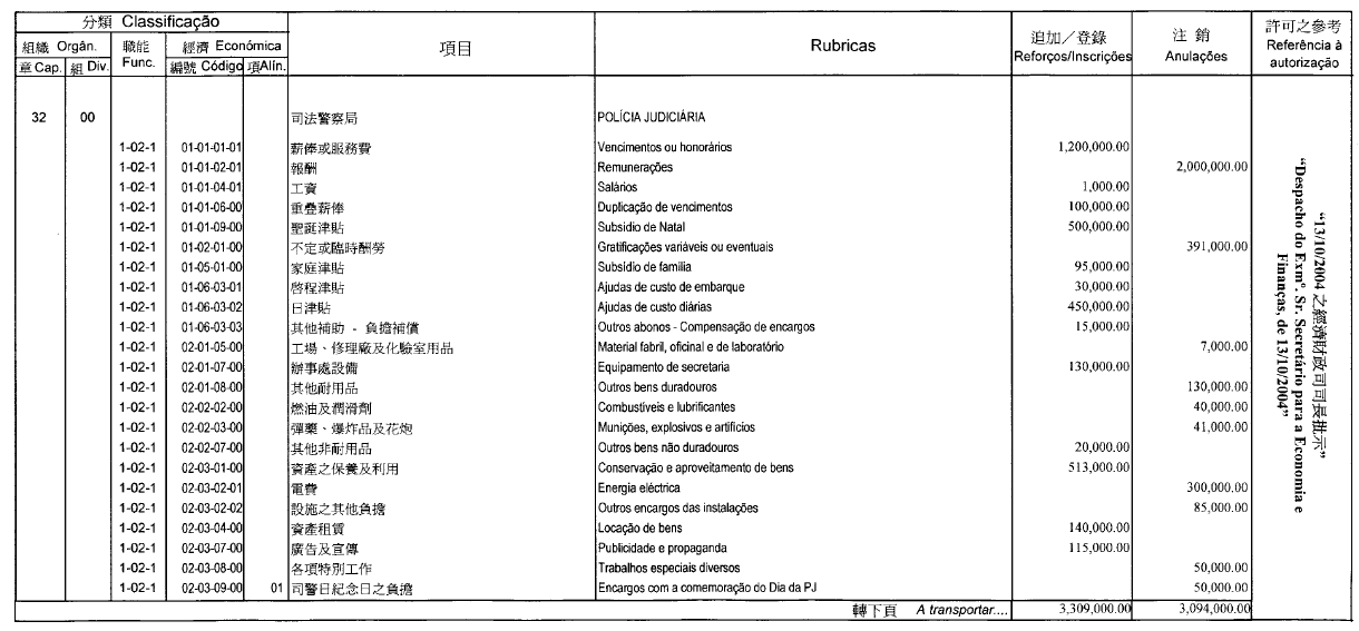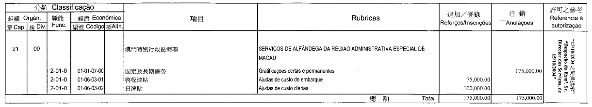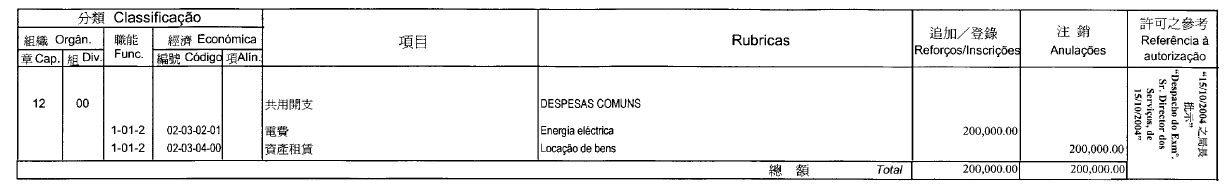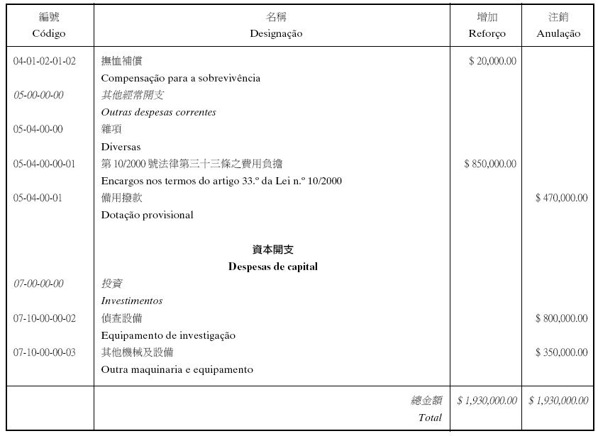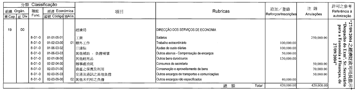 根據九月二十七日第53/93/M號法令第十九條規定,現刊登有關二零零四年度本身預算第二次修改,該等預算獲保安司司長在二零零四年十月十八日批示核准: