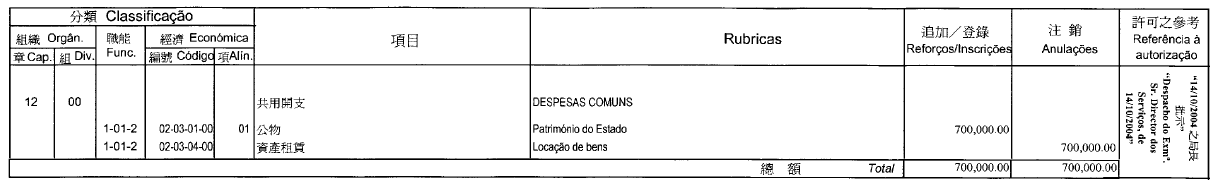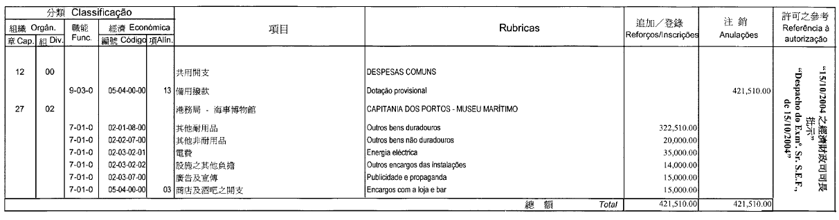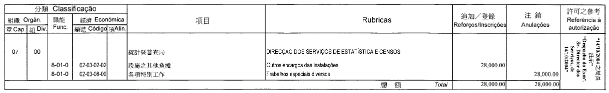 根據十二月十七日第17/2001號法律所核准的《民政總署章程》第二十九條第(一)項及九月二十七日第53/93/M號法令第十九條之規定,茲公佈行政法務司司長於二零零四年十月十九日批准之民政總署二零零四年度本身預算之第四次預算修改: