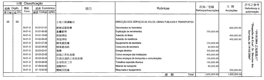 根據九月二十七日第53/93/M號法令第十九條規定,茲公佈運輸工務司司長於二零零四年十月十五日批示所核准的民航局二零零四年財政年度本身預算之第三修改: