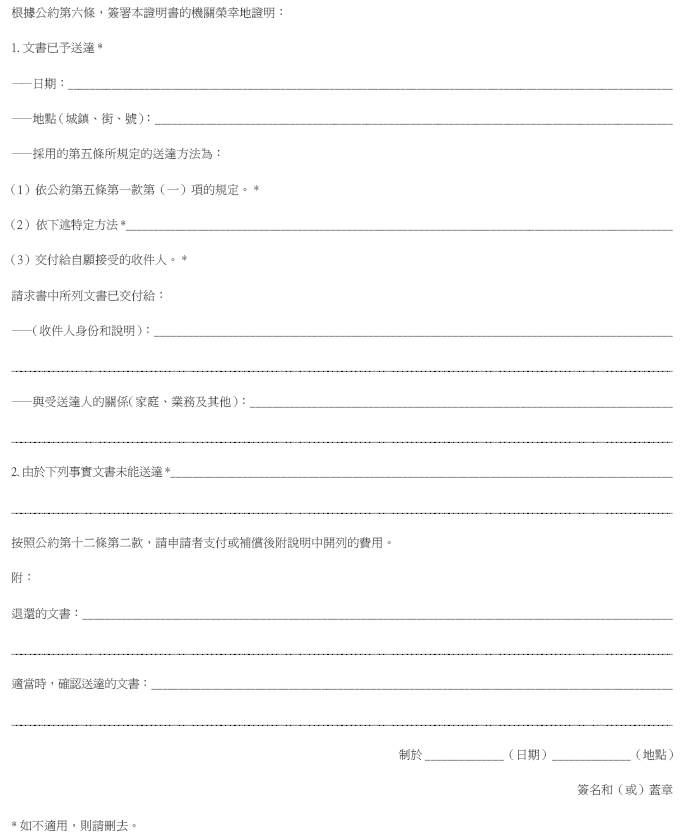文書發往國中央機關或該國為此目的可能指定的任何機關應依本公約所附範本格式出具證明書。