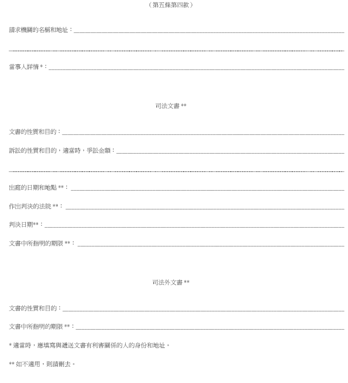 依本公約所附格式填寫的請求書中包括被送達文書概要的部分應連同文書一併送達。