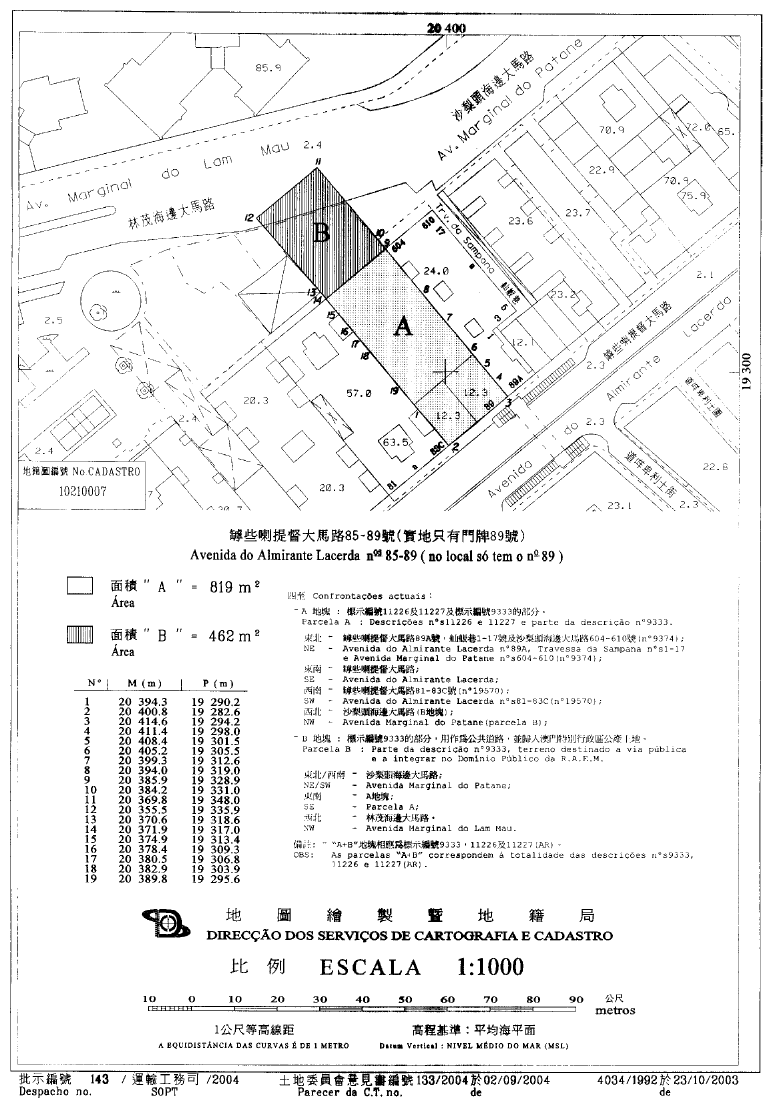 1) 修改一幅以租賃制度批給,位於澳門半島罅些喇提督大馬路,其上建有85至89號(實地只有門牌89號)樓宇,面積1281(壹仟貳佰捌拾壹)平方米,標示於物業登記局第9333、11226及11227號,以乙方名義登錄於該局第57455G號,並在地圖繪製暨地籍局於二零零三年十月二十三日發出的第4034/1992號地籍圖中以字母“A”及“B”標示的土地的批給合同。