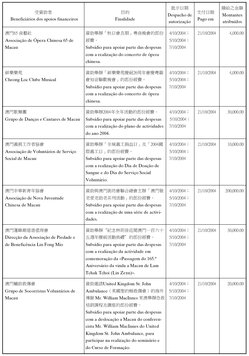| 澳門公務華員職工會 | 資助舉辦各項活動。 | 26.11.2004 | $ 80,000.00 |