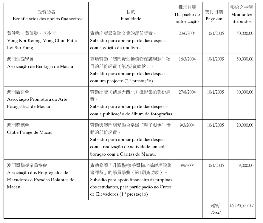 | 澳門理工學院學生會 | 31/12/2004 | $ 230,000.00 (a) | 為澳門理工學院學生會2005年度活動經費的津貼。 |