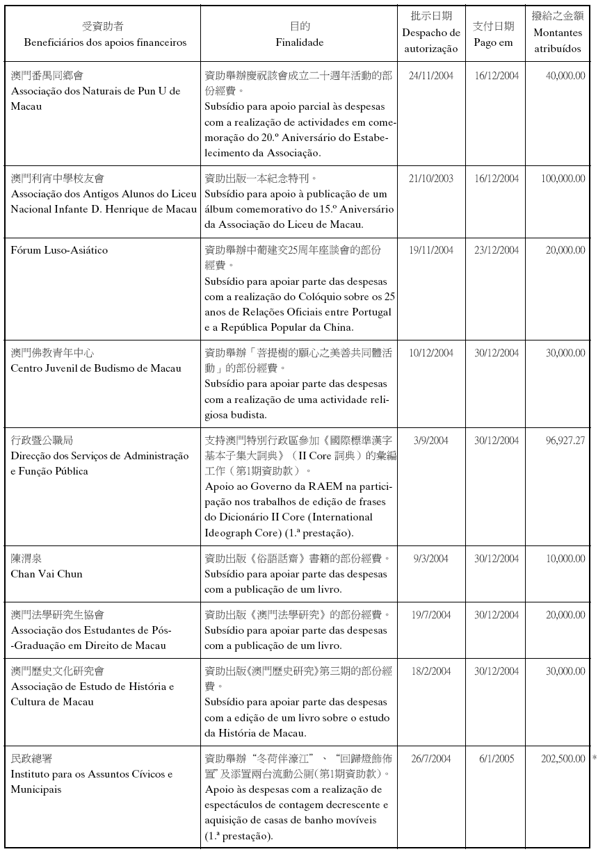 | 澳門公務專業人員協會 | 資助舉辦各項活動。 | 26.11.2004 | $ 80,000.00 |