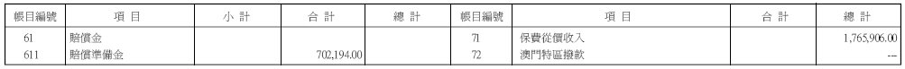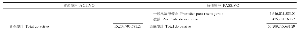 •在負債方面,由賠償準備金及財務準備金組成。概括而言,首先,賠償準備金較去年淨減少澳門幣七十萬元(即減幅達30.3%),是本基金基於所涉及的司法訴訟程序之判決結果而支付了賠償金。在財務準備金方面,增加了澳門幣七十萬元,主要包括呆帳準備金,是基於本基金之一宗索償個案之責任人宣稱沒有足夠經濟能力以償還有關款項而設立的;