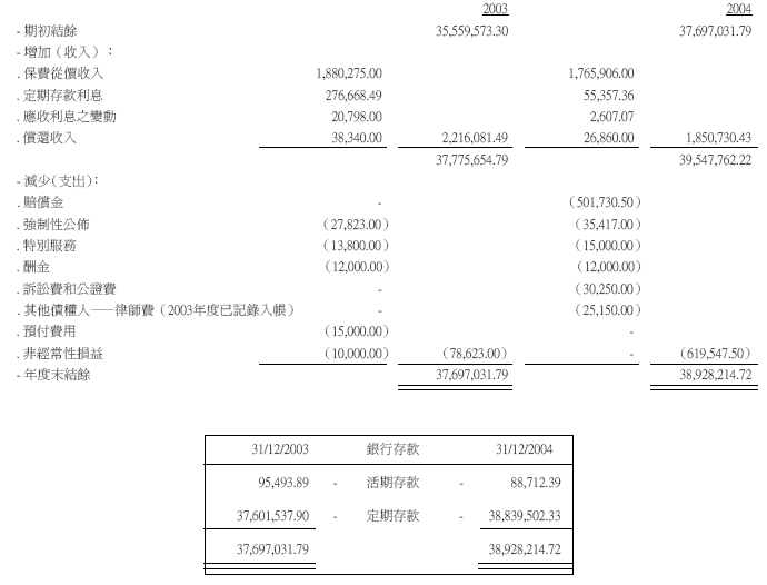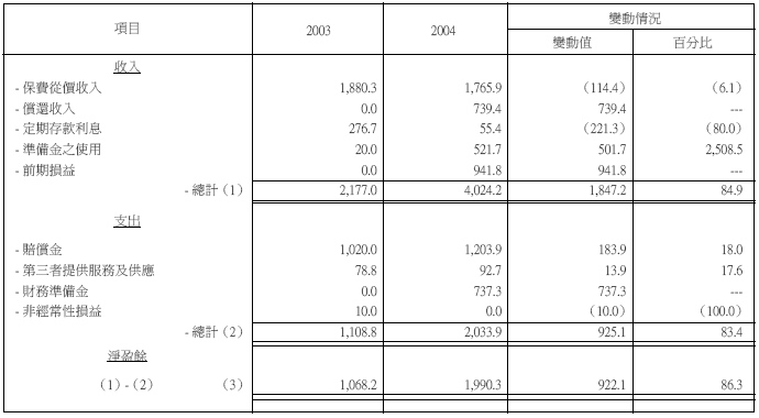 •在收益方面,對比二零零三年錄得正增長(+84.9%),其中主要是因為“前期損益”項目增加了澳門幣九十萬,及“準備金之使用”項目,於二零零四年增加達2,508.5%。此外,因為在二零零四年利率持續下調,致使“定期存款利息”項目出現80%的減幅,同時,亦由於“保費從價收入”項目出現負增長,減少了約澳門幣十一萬四仟四百元(即-6.1%);