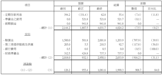 •在支出方面,對比去年亦有所增長,其中“ 賠償金 ”項目增加了(+18.0%),而“ 第三者提供服務及供應 ”項目亦增加(+17.6%),包括強制性公佈(+27.3%)、特別服務(+8.7%)、秘書酬金(0.0%)、訴訟費和公證費(+20.3%)。此外,於本年度增設了“ 財務準備金”項目,金額約為澳門幣七十三萬七仟三百元;
