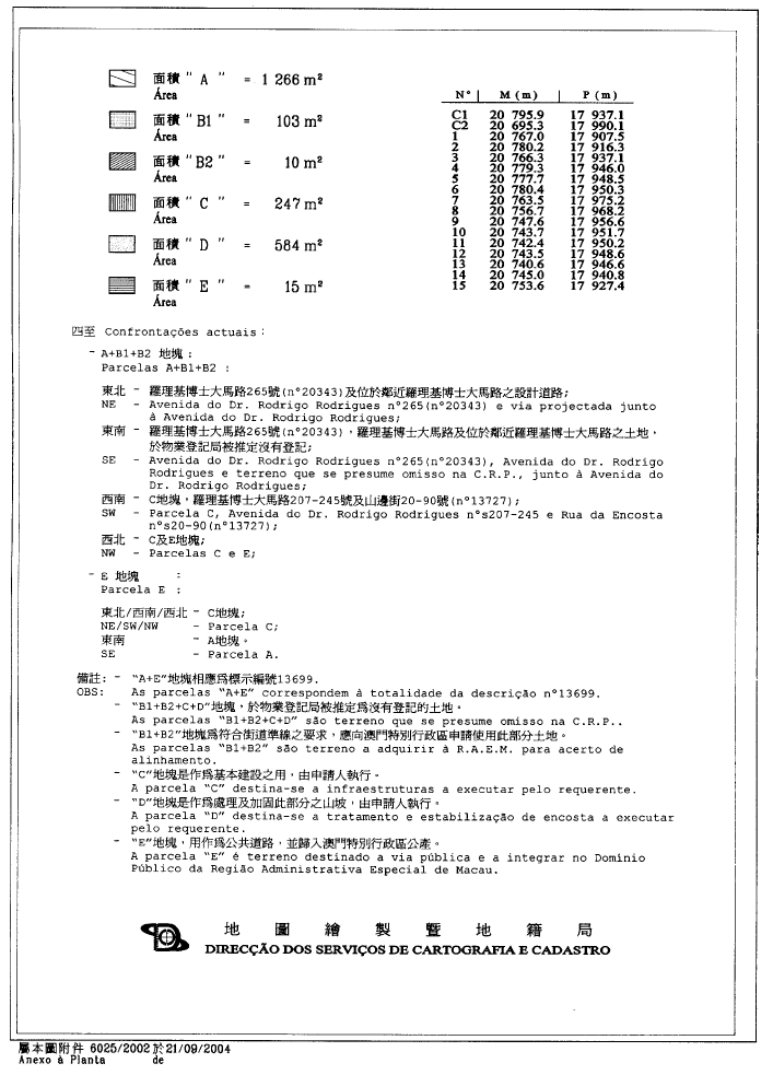 五、上述土地的面積為1,281平方米,在地圖繪製暨地籍局於二零零四年九月二十一日發出的第6025/2002號地籍圖中字母“A”及“E”標示。