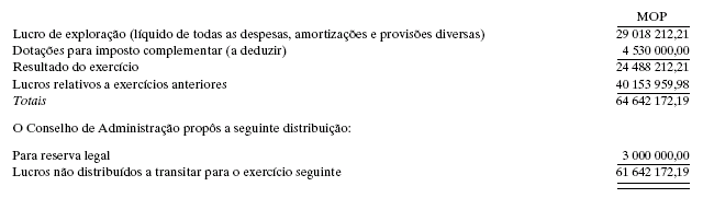 O Conselho de Administração propõe a aplicação de resultados seguintes: MOP 72.465 para a reserva legal e a transferência do valor remanescente de MOP 217.395 resultados transitados.