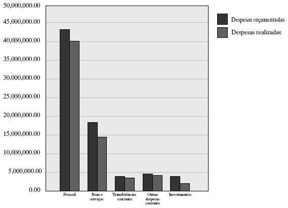 As despesas com «pessoal» representaram parte considerável das MOP 64 245 553,01 de despesas efectuadas, cifrando-se em MOP 40 105 722,78, representando 62,43% destas. Seguem-se as despesas com a aquisição de «bens e serviços», que totalizaram MOP 14 387 493,86, representando 22,39% das despesas efectuadas. Seguem-se «Outras despesas correntes», cifradas em MOP 4 144 120,37, perfazendo 6,45%. Vêm depois as despesas com as transferências correntes, no total de MOP 3 583 986,00, perfazendo 5,58%. As despesas de investimento foram de MOP 2 024 230,00, representando 3,15% das despesas efectuadas.