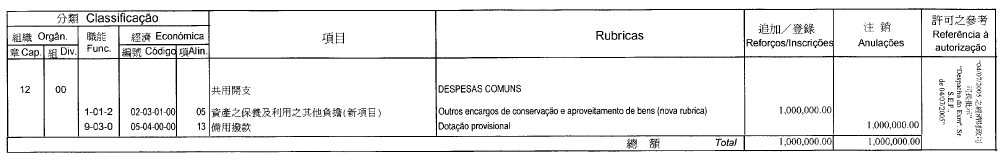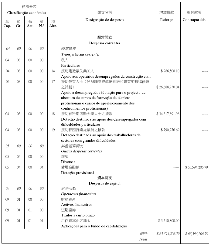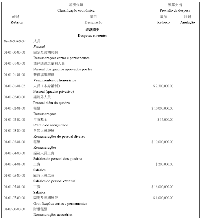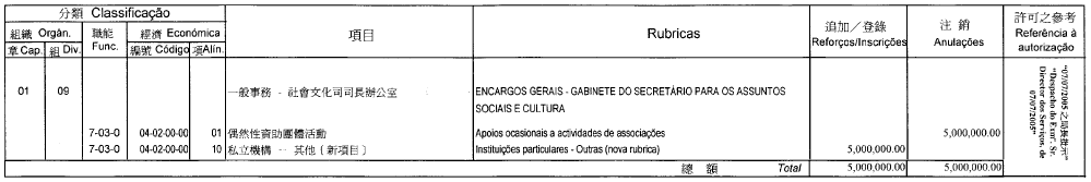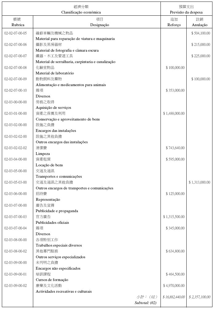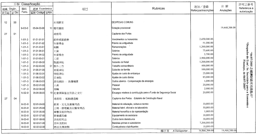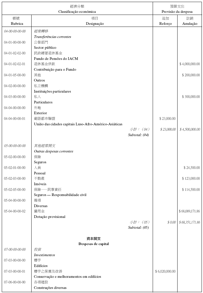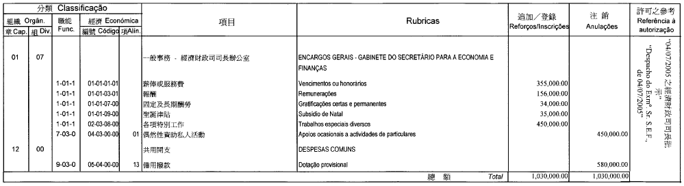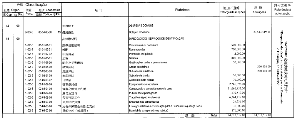 根據十二月十七日第17/2001號法律核准的《民政總署章程》第二十九條第(一)項及九月二十七日第53/93/M號法令第十九條之規定,茲公佈行政法務司司長於二零零五年七月七日批准之民政總署二零零五年度本身預算之第二次預算修改,有關之修改已於二零零五年七月四日獲經濟財政司司長作出同意之批示: