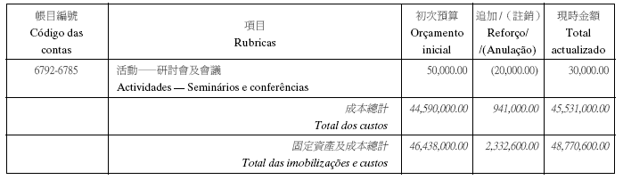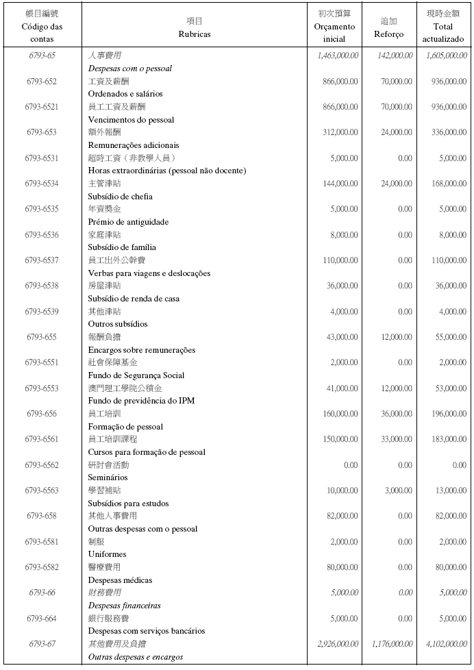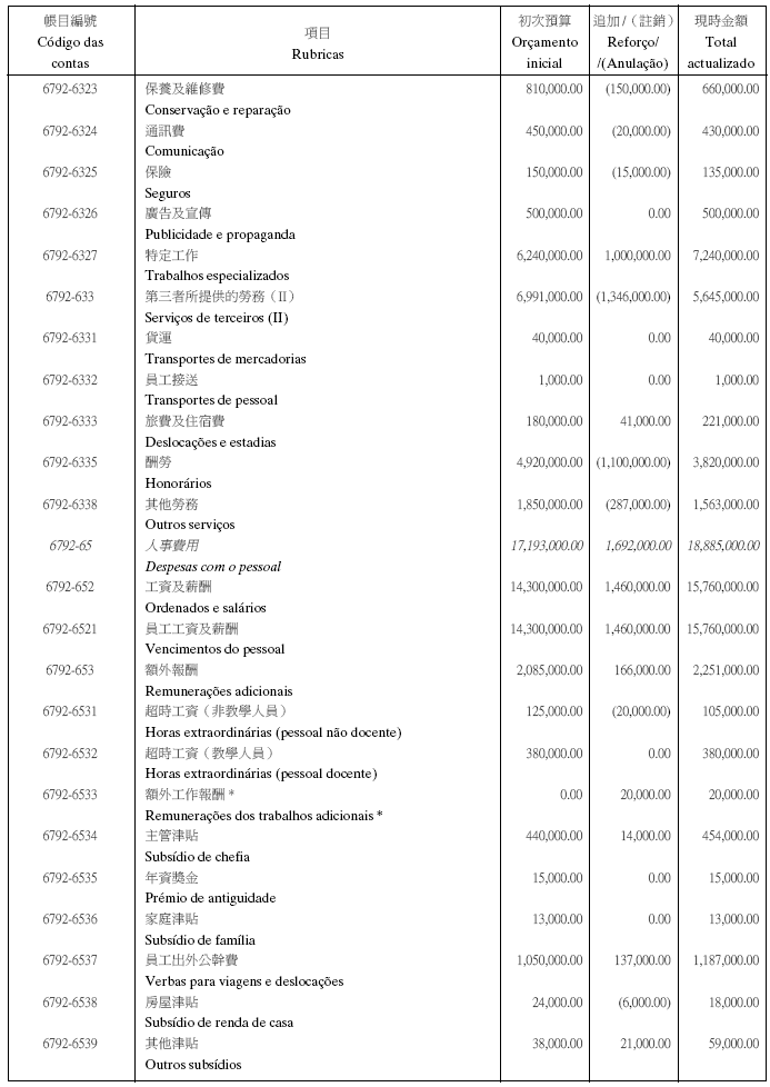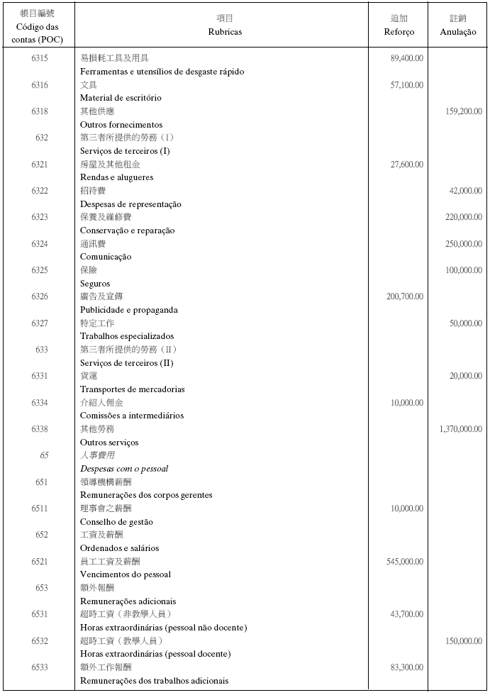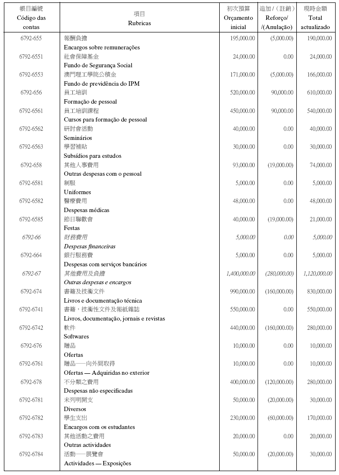 根據九月二十七日第53/93/M號法令第十九條之規定,現刊登有關澳門理工學院二零零五年度本身預算之第一修改,該修改獲社會文化司司長在二零零五年六月九日及經濟財政司司長在二零零五年七月五日之批示核准: