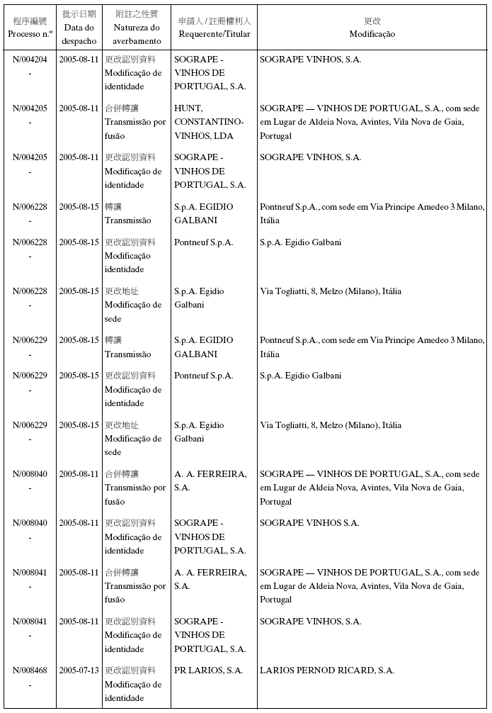 Produtos: aguardente, vinhos (bebidas); vinho branco; líquidos alcoólicos; vinho de arroz; bebidas alcoólicas (com excepção de cervejas); vinho tratado.