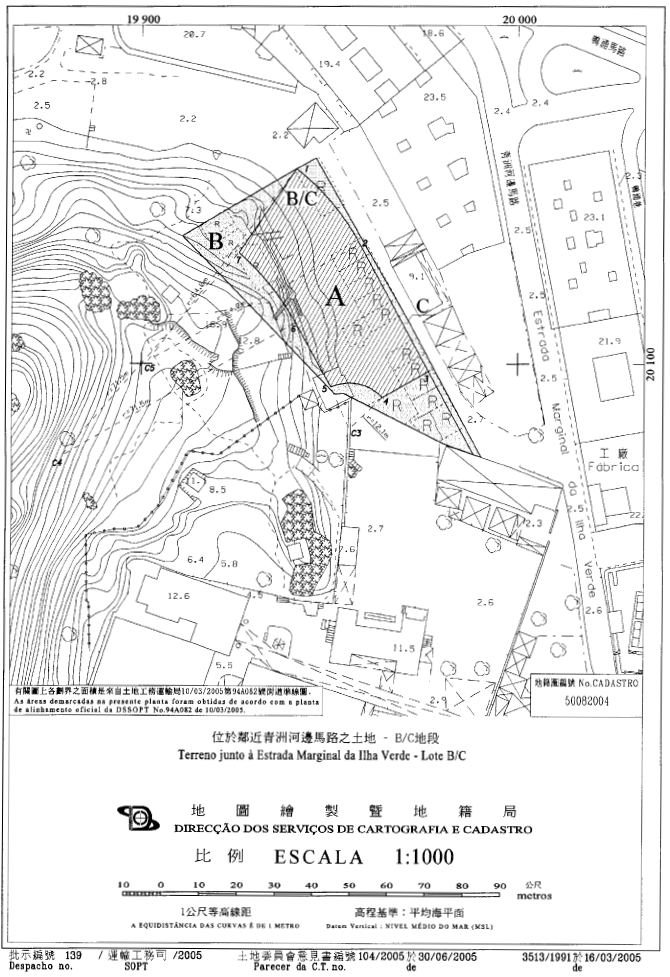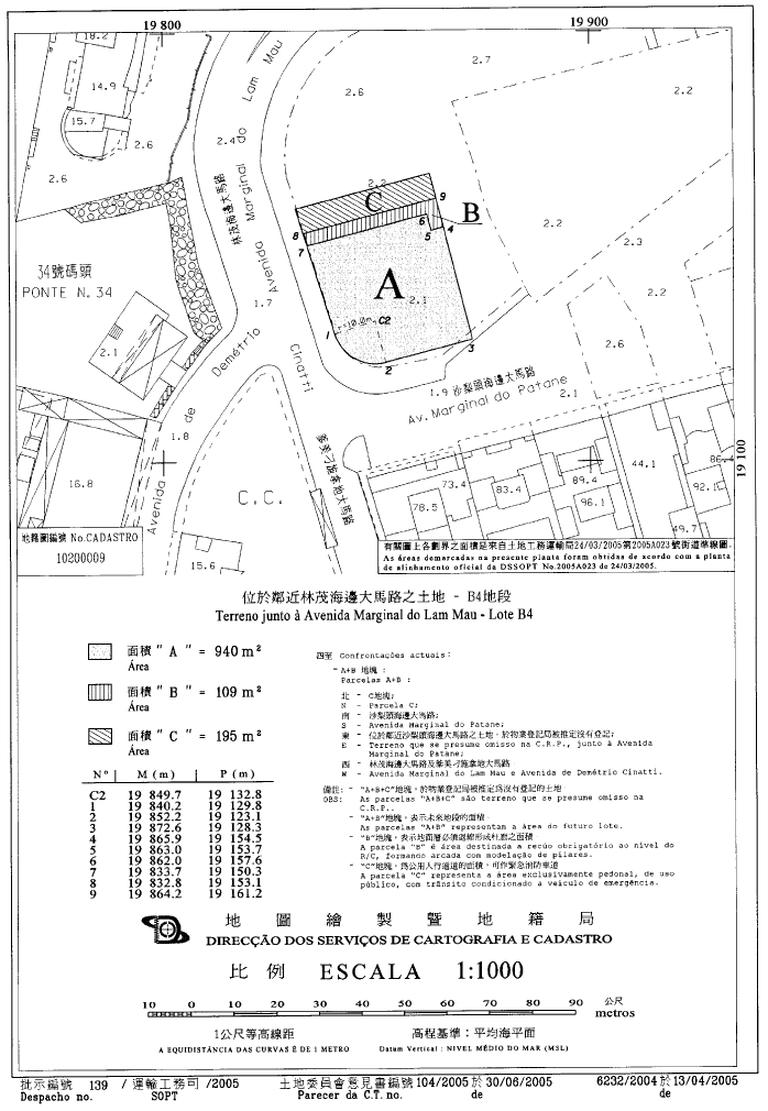 十、批給標的之土地面積為1,049平方米,在地圖繪製暨地籍局於二零零五年四月十三日發出的第6232/2004號地籍圖中以字母“A”、“B”及“C”標示,而在物業登記局未有標示。